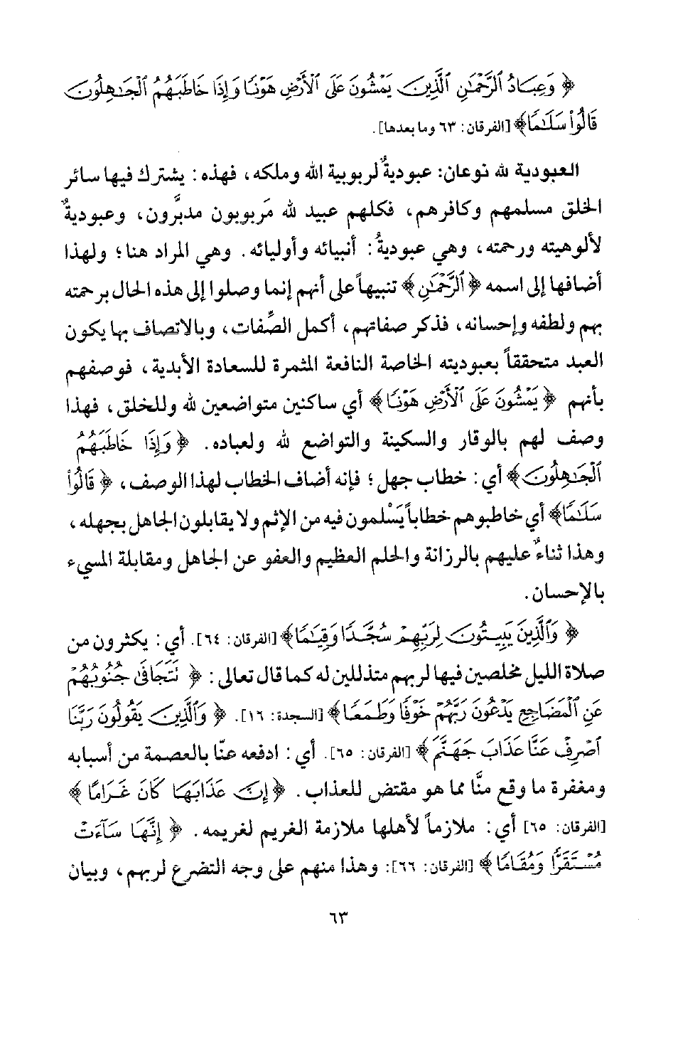 العبودية لله نوعان: عبودية لربوبية الله وملكه، فهذه يشترك فيها سائر الخلق مسلمهم وكافرهم، فكلهم عبيد لله مربوبون مدبرون، وعبودية لألوهيته ورحمته، وهي عبودية أنبيائه وأوليائه، وهي المراد هنا، ولهذا أضافها إلى اسمه (الرَّحْمَنِ) تنبيها على أنهم إنما وصلوا إلى هذه الحال برحمته بهم ولطفه وإحسانه، فذكر صفاتهم، أكمل الصفات، وبالاتصاف بها يكون العبد متحققا بعبوديته الخاصة النافعة المثمرة للسعادة الأبدية، فوصفهم بأنهم {يَمْشُونَ عَلَى الْأَرْضِ هَوْنًا} [الفرقان: 63] أي: ساكنين متواضعين لله وللخلق، فهذا وصف لهم بالوقار والسكينة والتواضع لله ولعباده، {وَإِذَا خَاطَبَهُمُ الْجَاهِلُونَ} [الفرقان: 63] أي: خطاب جهل، فإنه أضاف الخطاب لهذا الوصف، {قَالُوا سَلَامًا} [الفرقان: 63] أي: خاطبوهم خطابا يسلمون فيه من الإثم، ولا يقابلون الجاهل بجهله، وهذا ثناء عليهم بالرزانة والحلم العظيم والعفو عن الجاهل ومقابلة المسيء بالإحسان.