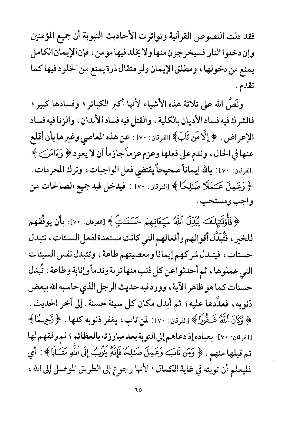 ونص الله على ثلاثة هذه الأشياء لأنها أكبر الكبائر، وفسادها كبير، فالشرك فيه فساد الأديان بالكلية، والقتل فيه فساد الأبدان، والزنا فيه فساد الأعراض {إِلَّا مَنْ تَابَ} [الفرقان: 70] عن هذه المعاصي وغيرها بأن أقلع عنها في الحال، وندم على فعلها، وعزم عزما جازما أن لا يعود، {وَآمَنَ} [الفرقان: 70] بالله إيمانا صحيحا يقتضي فعل الواجبات، وترك المحرمات، {وَعَمِلَ عَمَلًا صَالِحًا} [الفرقان: 70] فيدخل فيه جميع الصالحات من واجب ومستحب.