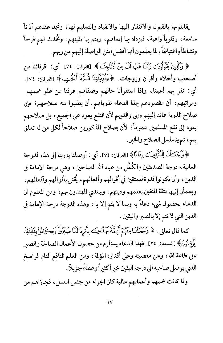 {وَاجْعَلْنَا لِلْمُتَّقِينَ إِمَامًا} [الفرقان: 74] أي: أوصلنا يا ربنا إلى هذه الدرجة العالية، درجة الصديقين والكمل من عباد الله الصالحين، وهي درجة الإمامة في الدين، وأن يكونوا قدوة للمتقين في أقوالهم وأفعالهم، يقتدي بأقوالهم وأفعالهم، ويطمأن إليها لثقة المتقين بعلمهم ودينهم، ويهتدي المهتدون بهم، ومن المعلوم أن الدعاء بحصول شيء دعاء به، وبما لا يتم إلا به، وهذه الدرجة درجة الإمامة في الدين التي لا تتم إلا بالصبر واليقين.