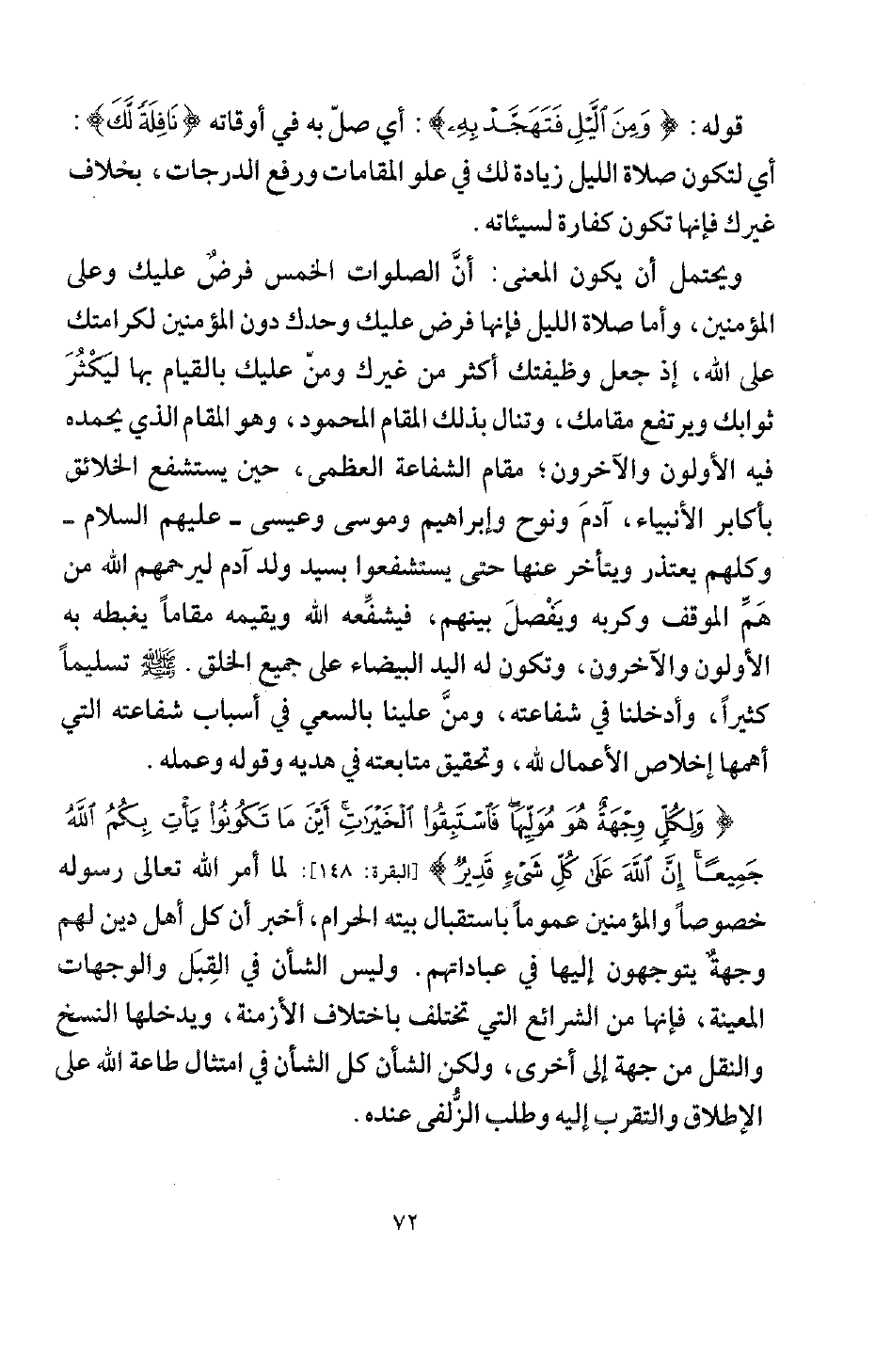 ويحتمل أن يكون المعنى أن الصلوات الخمس فرض عليك وعلى المؤمنين، وأما صلاة الليل فإنها فرض عليك وحدك دون المؤمنين لكرامتك على الله، إذ جعل وظيفتك أكثر من غيرك، ومن عليك بالقيام بها؛ ليكثر ثوابك، ويرتفع مقامك، وتنال بذلك المقام المحمود، وهو المقام الذي يحمده فيه الأولون والآخرون؛ مقام الشفاعة العظمى حين يستشفع الخلائق بأكابر الأنبياء، آدم ونوح وإبراهيم وموسى وعيسى - عليهم السلام -، وكلهم يعتذر ويتأخر عنها حتى يستشفعوا بسيد ولد آدم؛ ليرحمهم الله من هم الموقف وكربه، ويفصل بينهم، فيشفعه الله، ويقيمه مقاما يغبطه به الأولون والآخرون، وتكون له اليد البيضاء على جميع الخلق، صلى الله عليه وسلم تسليما كثيرا، وأدخلنا في شفاعته، ومن علينا بالسعي في أسباب شفاعته التي أهمها إخلاص الأعمال لله، وتحقيق متابعته في هديه وقوله وعمله.