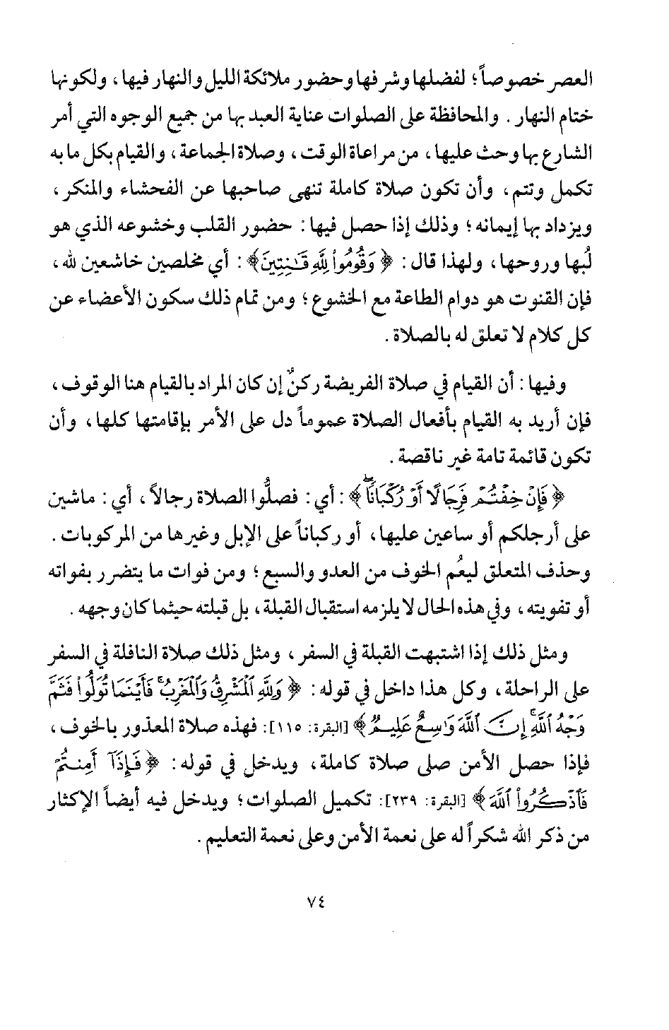 العصر خصوصا، لفضلها وشرفها وحضور ملائكة الليل والنهار فيها، ولكونها ختام النهار، والمحافظة على الصلوات عناية العبد بها من جميع الوجوه التي أمر الشارع بها وحث عليها من: مراعاة الوقت، وصلاة الجماعة، والقيام بكل ما به تكمل وتتم، وأن تكون صلاة كاملة تنهى صاحبها عن الفحشاء والمنكر، ويزداد بها إيمانه، وذلك إذا حصل فيها حضور القلب وخشوعه الذي هو لبها وروحها، ولهذا قال: {وَقُومُوا لِلَّهِ قَانِتِينَ} [البقرة: 238] أي: مخلصين خاشعين لله، فإن القنوت هو دوام الطاعة مع الخشوع؛ ومن تمام ذلك سكون الأعضاء عن كل كلام لا تعلق له بالصلاة.