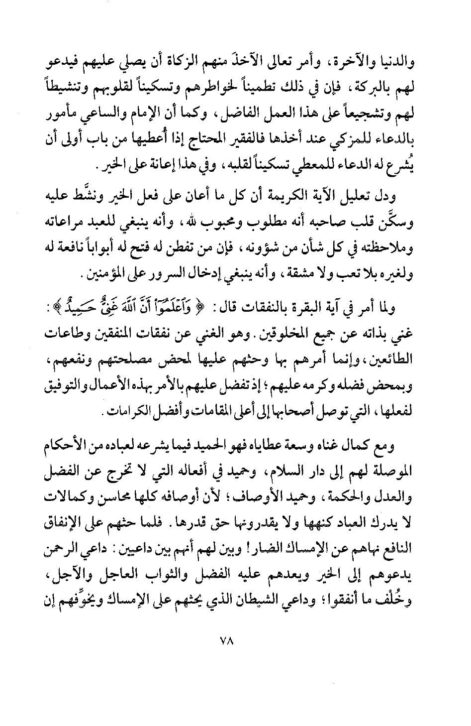 والدنيا والآخرة، وأمر تعالى الآخذ منهم الزكاة أن يصلي عليهم فيدعو لهم بالبركة، فإن في ذلك تطمينا لخواطرهم، وتسكينا لقلوبهم، وتنشيطا لهم، وتشجيعا على هذا العمل الفاضل، وكما أن الإمام والساعي مأمور بالدعاء للمزكي عند أخذها فالفقير المحتاج إذا أعطيها من باب أولى أن يشرع له الدعاء للمعطي تسكينا لقلبه، وفي هذا إعانة على الخير.