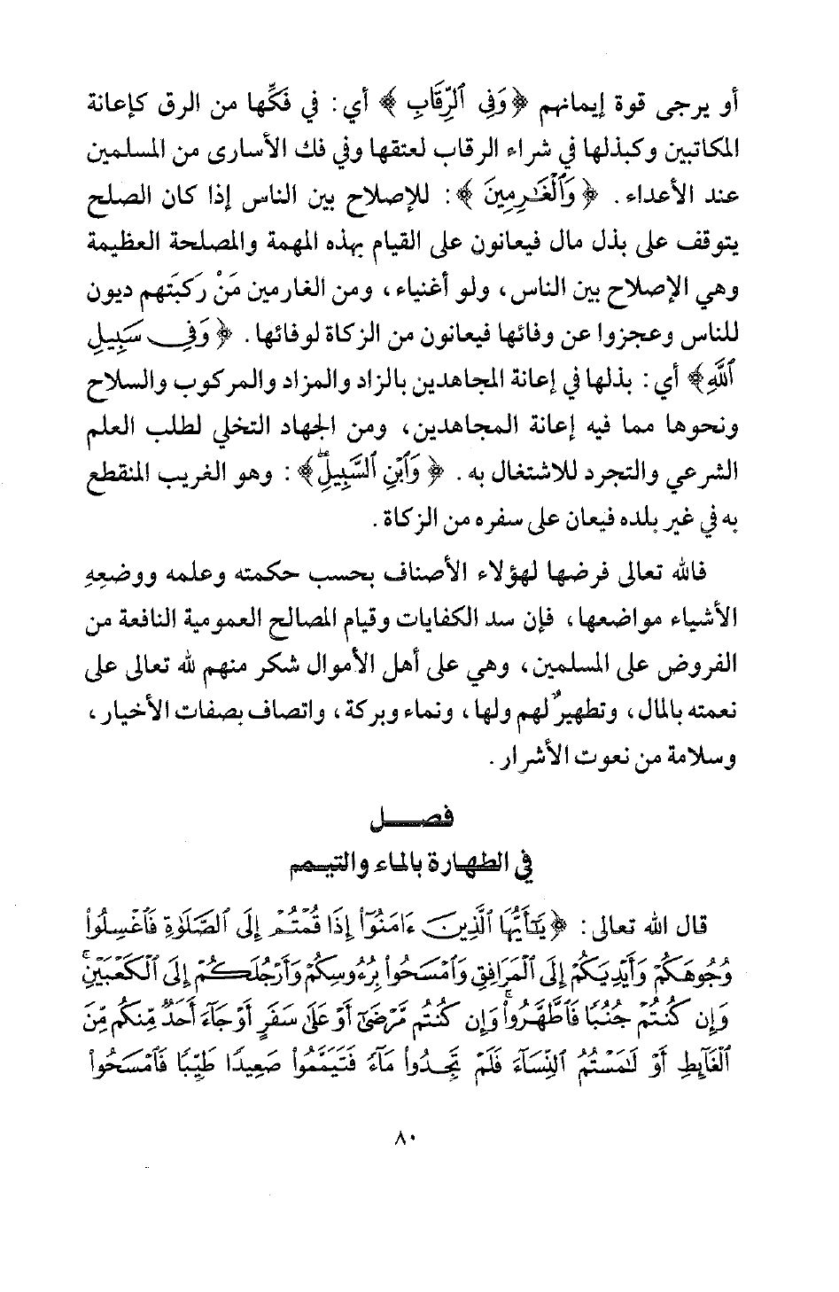 أو يرجى قوة إيمانهم، {وَفِي الرِّقَابِ} [التوبة: 60] أي: في فكها من الرق كإعانة المكاتبين، وكبذلها في شراء الرقاب لعتقها، وفي فك الأسارى من المسلمين عند الأعداء، {وَالْغَارِمِينَ} [التوبة: 60] للإصلاح بين الناس إذا كان الصلح يتوقف على بذل مال، فيعانون على القيام بهذه المهمة والمصلحة العظيمة، وهي الإصلاح بين الناس، ولو أغنياء، ومن الغارمين من ركبتهم ديون للناس وعجزوا عن وفائها، فيعانون من الزكاة لوفائها، {وَفِي سَبِيلِ اللَّهِ} [التوبة: 60] أي: بذلها في إعانة المجاهدين بالزاد والمزاد والمركوب والسلاح ونحوها مما فيه إعانة المجاهدين، ومن الجهاد التخلي لطلب العلم الشرعي والتجرد للاشتغال به، {وَاِبْنِ السَّبِيلِ} [التوبة: 60] وهو الغريب المنقطع به في غير بلده، فيعان على سفره من الزكاة.