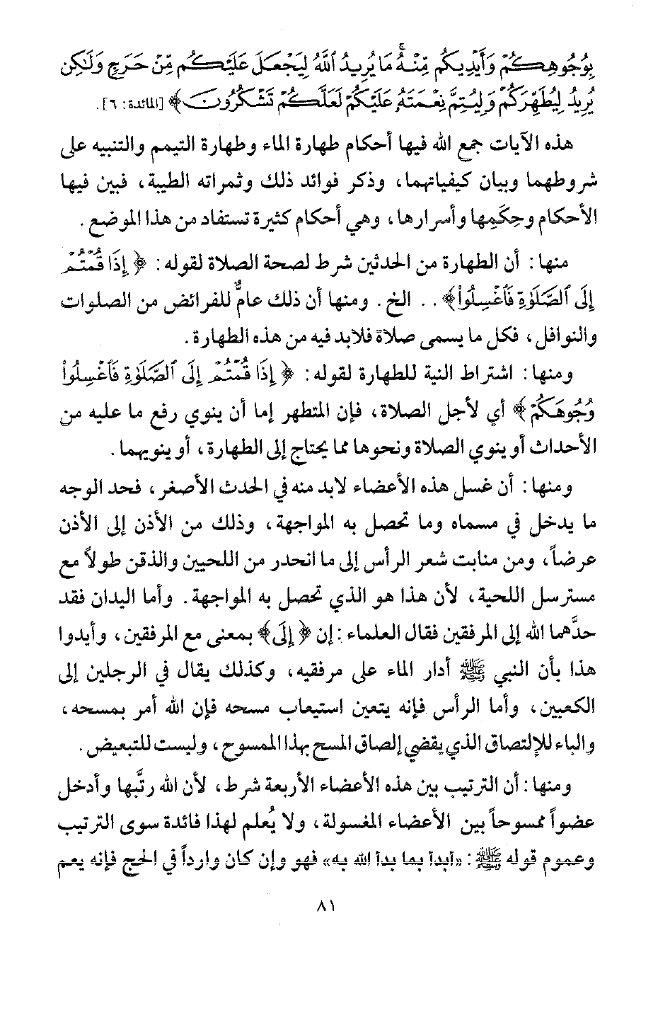 ومنها: أن الترتيب بين هذه الأعضاء الأربعة شرط، لأن الله رتبها، وأدخل عضوا ممسوحا بين الأعضاء المغسولة، ولا يعلم لهذا فائدة سوى الترتيب وعموم قوله صلى الله عليه وسلم: «ابدأ بما بدأ الله به» ، فهو وإن كان واردا في الحج فإنه يعم