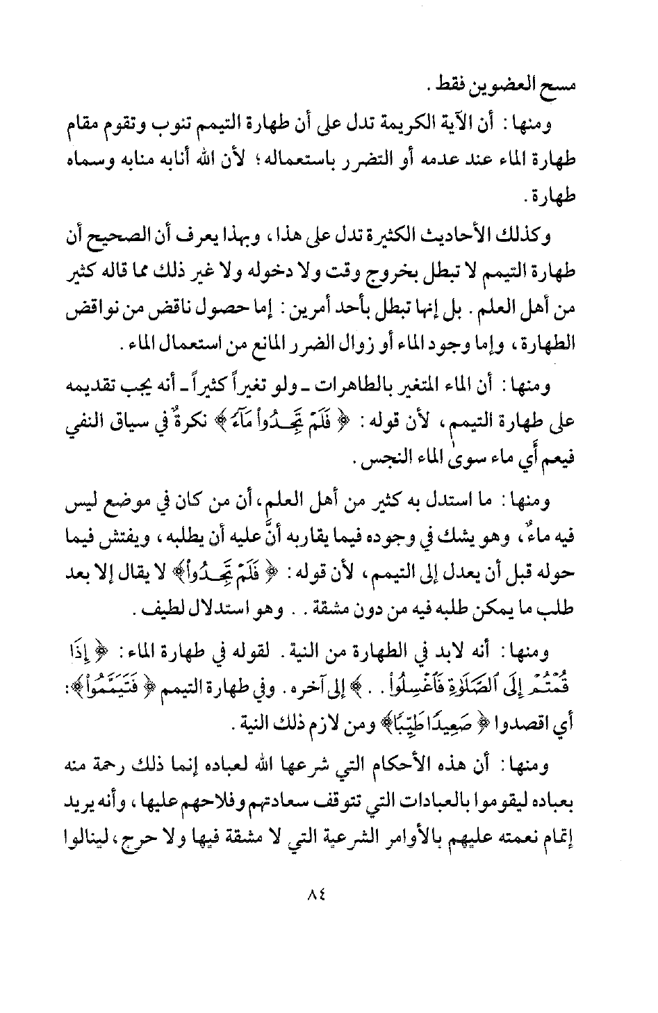 ومنها: أنه لا بد في الطهارة من النية؛ لقوله في طهارة الماء: {إِذَا قُمْتُمْ إِلَى الصَّلَاةِ فَاغْسِلُوا} [المائدة: 6] ) إلى آخره، وفي طهارة التيمم: {فَتَيَمَّمُوا} [المائدة: 6] أي: اقصدوا {صَعِيدًا طَيِّبًا} [المائدة: 6] ومن لازم ذلك النية.