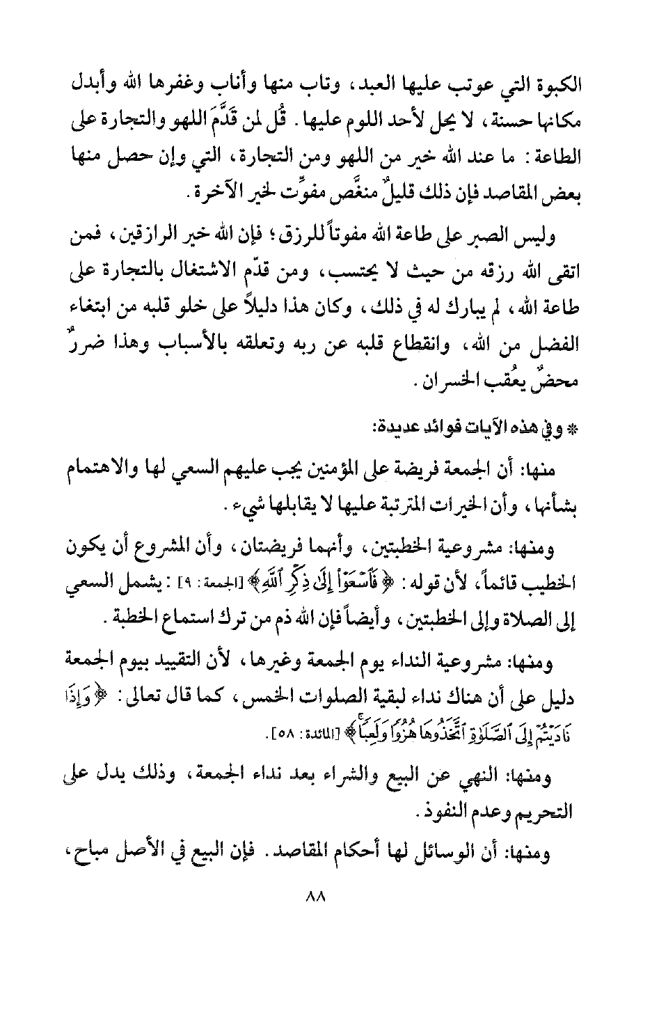 منها: أن الجمعة فريضة على المؤمنين يجب عليهم السعي لها والاهتمام بشأنها، وأن الخيرات المترتبة عليها لا يقابلها شيء.