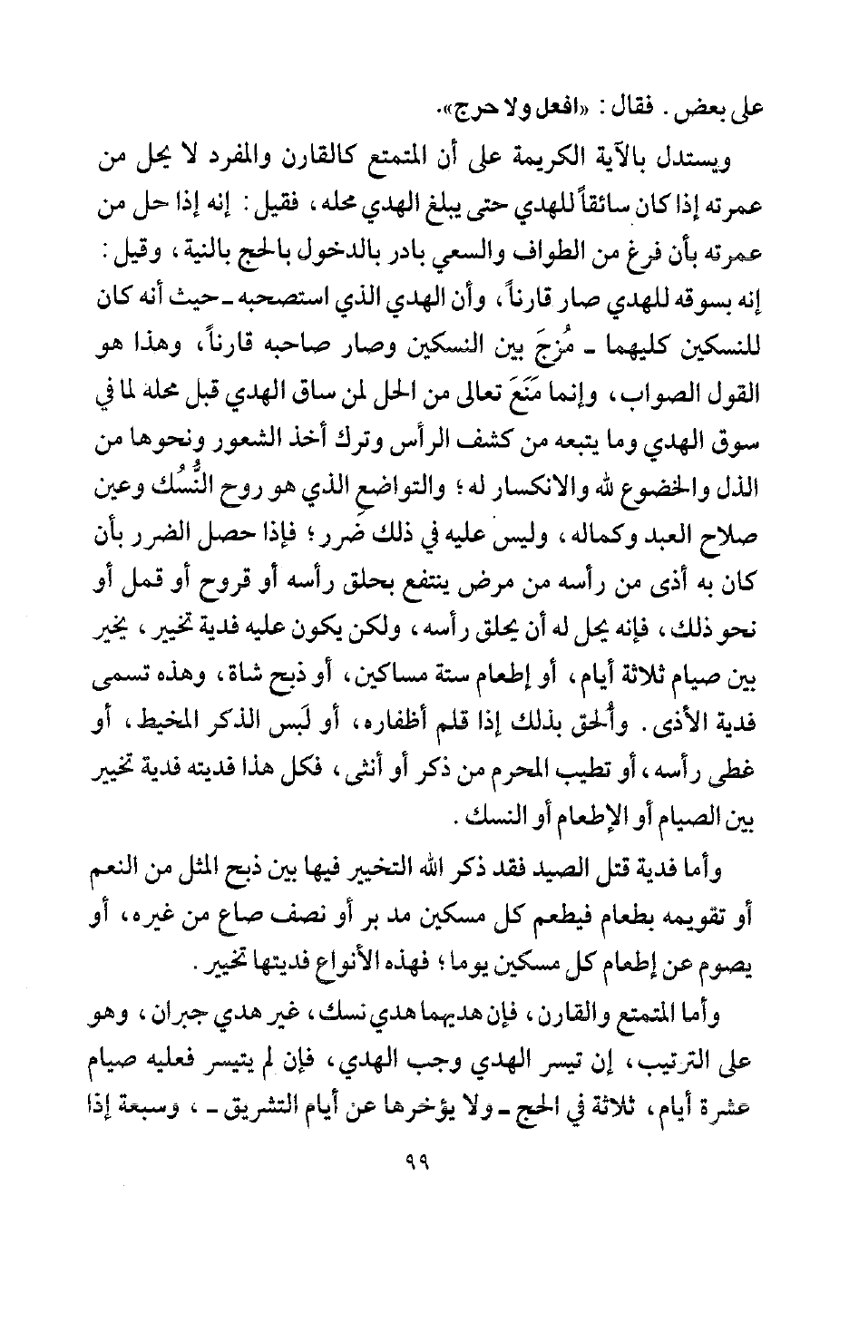 ويستدل بالآية الكريمة على أن المتمتع كالقارن والمفرد لا يحل من عمرته إذا كان سائقا للهدي حتى يبلغ الهدي محله، فقيل: إنه إذا حل من عمرته بأن فرغ من الطواف والسعي بادر بالدخول بالحج بالنية، وقيل: إنه بسوقه للهدي صار قارنا، وأن الهدي الذي استصحبه - حيث إنه كان للنسكين كليهما - مزج بين النسكين وصار صاحبه قارنا، وهذا هو القول الصواب، وإنما منع تعالى من الحل لمن ساق الهدي قبل محله لما في سوق الهدي، وما يتبعه من كشف الرأس، وترك أخذ الشعور ونحوها من الذل والخضوع لله والانكسار له، والتواضع الذي هو روح النسك وعين صلاح العبد وكماله، وليس عليه في ذلك ضرر؛ فإذا حصل الضرر بأن كان به أذى من رأسه من مرض ينتفع بحلق رأسه أو قروح أو قمل أو نحو ذلك، فإنه يحل له أن يحلق رأسه، ولكن يكون عليه فدية تخيير، يخير بين صيام ثلاثة أيام، أو إطعام ستة مساكين، أو ذبح شاة، وهذه تسمى فدية الأذى، وألحق بذلك إذا قلم أظفاره، أو لبس الذكر المخيط، أو غطى رأسه، أو تطيب المحرم من ذكر وأنثى، فكل هذا فديته فدية تخيير بين الصيام أو الإطعام أو النسك.