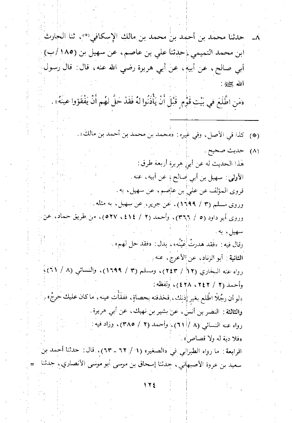 8 - حَدَّثَنَا مُحَمَّدُ بْنُ أَحْمَدَ بْنِ مُحَمَّدِ بْنِ مَالِكٍ الْإِسْكَافِيُّ، ثنا الْحَارِثُ بْنُ مُحَمَّدٍ التَّمِيمِيُّ، حَدَّثَنَا عَلِيُّ بْنُ عَاصِمٍ، عَنْ سُهَيْلِ بْنِ أَبِي صَالِحٍ، عَنْ أَبِيهِ، عَنْ أَبِي هُرَيْرَةَ، رَضِيَ اللَّهُ عَنْهُ قَالَ: قَالَ رَسُولُ اللَّهِ صَلَّى اللَّهُ عَلَيْهِ وَسَلَّمَ: §«مَنِ اطَّلَعَ فِي بَيْتِ قَوْمٍ قَبْلَ أَنْ يَأْذَنُوا لَهُ فَقَدْ حَلَّ لَهُمْ أَنْ يَفْقَؤُوا عَيْنَهُ»