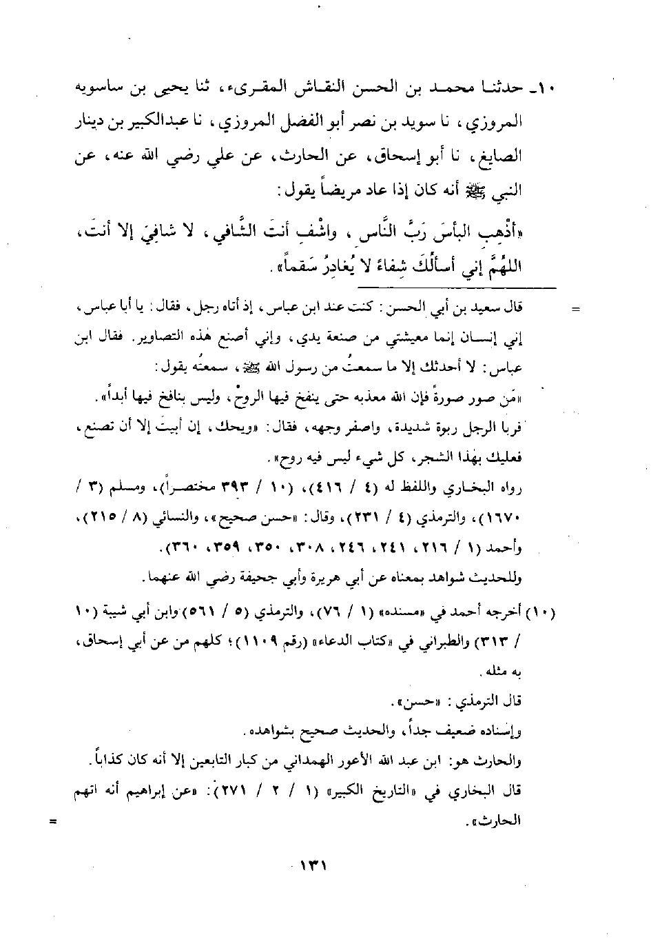 10 - حَدَّثَنَا مُحَمَّدُ بْنُ الْحَسَنِ النَّقَّاشُ الْمُقْرِئُ، ثنا يَحْيَى بْنُ سَاسَوَيْهِ الْمَرْوَزِيُّ، نا سُوَيْدُ بْنُ نَصْرٍ أَبُو الْفَضْلِ الْمَرْوَزِيُّ، نا عَبْدُ الْكَبِيرِ بْنُ دِينَارٍ الصَّايِغُ، نا أَبُو إِسْحَاقَ، عَنِ الْحَارِثِ، عَنْ عَلِيٍّ، رَضِيَ اللَّهُ عَنْهُ، عَنِ النَّبِيِّ صَلَّى اللَّهُ عَلَيْهِ وَسَلَّمَ أَنَّهُ كَانَ إِذَا عَادَ مَرِيضًا يَقُولُ: «§أَذْهِبِ الْبَأْسَ رَبَّ النَّاسِ، وَاشْفِ أَنْتَ الشَّافِي، لَا شَافِيَ إِلَّا أَنْتَ، اللَّهُمَّ إِنِّي أَسْأَلُكَ شِفَاءً لَا يُغَادِرُ سَقَمًا»