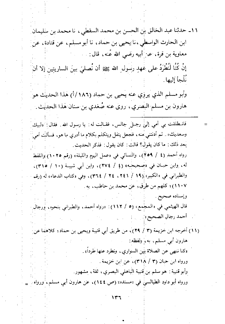 11 - حَدَّثَنَا عَبْدُ الْخَالِقِ بْنُ الْحَسَنِ بْنِ مُحَمَّدٍ السَّقَطِيُّ، نا مُحَمَّدُ بْنُ سُلَيْمَانَ بْنِ الْحَارِثِ الْوَاسِطِيُّ، نا يَحْيَى بْنِ حَمَّادٍ، نا أَبُو مُسْلِمٍ، عَنْ قَتَادَةَ، عَنْ مُعَاوِيَةَ بْنِ قُرَّةَ، عَنْ أَبِيهِ، رَضِيَ اللَّهُ عَنْهُ قَالَ: §" إِنَّ كُنَّا لَنُطْرَدُ عَلَى عَهْدِ رَسُولِ اللَّهِ صَلَّى اللَّهُ عَلَيْهِ وَسَلَّمَ أَنْ نُصَلِّيَ بَيْنَ السَّارِيَتَيْنِ إِلَّا أَنْ نُلْجَأَ إِلَيْهَا؟ . وَأَبُو مُسْلِمٍ الَّذِي يَرْوِي عَنْهُ يَحْيَى بْنُ حَمَّادٍ هَذَا الْحَدِيثَ هُوَ هَارُونُ بْنُ مُسْلِمٍ الْبَصْرِيُّ، رَوَى عَنْهُ صُغْدِيُّ بْنُ سِنَانٍ هَذَا الْحَدِيثِ