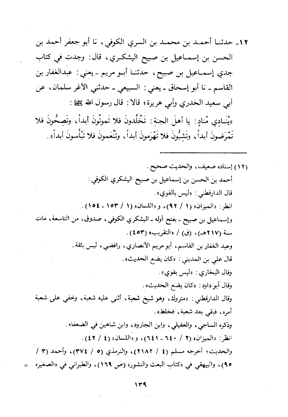 12 - حَدَّثَنَا أَحْمَدُ بْنُ مُحَمَّدِ بْنِ السَّرِيِّ الْكُوفِيُّ، نا أَبُو جَعْفَرٍ أَحْمَدُ بْنُ الْحَسَنِ بْنِ إِسْمَاعِيلَ بْنِ صُبَيْحٍ الْيَشْكُرِيُّ قَالَ: وَجَدْتُ فِي كِتَابِ جَدِّي إِسْمَاعِيلَ بْنِ صُبَيْحٍ: حَدَّثَنَا أَبُو مَرْيَمَ يَعْنِي عَبْدَ الْغَفَّارِ بْنَ الْقَاسِمِ، نا أَبُو إِسْحَاقَ يَعْنِي السَّبِيعِيَّ، حَدَّثَنِي الْأَغَرُّ سَلْمَانُ، عَنْ أَبِي سَعِيدٍ الْخُدْرِيِّ، وَأَبِي هُرَيْرَةَ قَالَا: قَالَ رَسُولُ اللَّهِ صَلَّى اللَّهُ عَلَيْهِ وَسَلَّمَ: " يُنَادِي مُنَادٍ: §يَا أَهْلَ الْجَنَّةِ، تَخْلُدُونَ فَلَا تَمُوتُونَ أَبَدًا، وَتَصِحُّونَ فَلَا تَمْرَضُونَ أَبَدًا، وَتَشِبُّونَ فَلَا تَهْرَمُونَ أَبَدًا، وَتَنْعَمُونَ فَلَا تَبْأَسُونَ أَبَدًا "