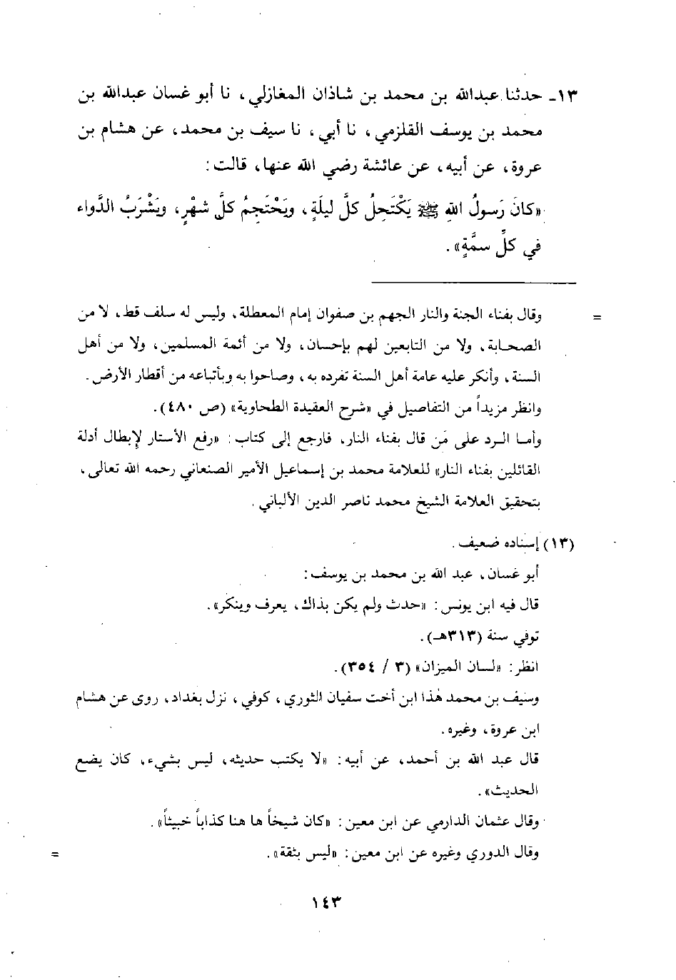 13 - حَدَّثَنَا عَبْدُ اللَّهِ بْنُ مُحَمَّدِ بْنِ شَاذَانَ الْمَغَازِلِيُّ، نا أَبُو غَسَّانَ عَبْدُ اللَّهِ بْنُ مُحَمَّدِ بْنِ يُوسُفَ الْقَلْزَمِيُّ، نا أَبِي نا سَيْفُ بْنُ مُحَمَّدٍ، عَنْ هِشَامِ بْنِ عُرْوَةَ، عَنْ أَبِيهِ، عَنْ عَائِشَةَ، رَضِيَ اللَّهُ عَنْهَا قَالَتْ: كَانَ رَسُولُ اللَّهِ صَلَّى اللَّهُ عَلَيْهِ وَسَلَّمَ §يَكْتَحِلُ كُلَّ لَيْلَةٍ، وَيَحْتَجِمُ كُلَّ شَهْرٍ، وَيَشْرَبُ الدَّوَاءَ فِي كُلِّ سِمَّةٍ