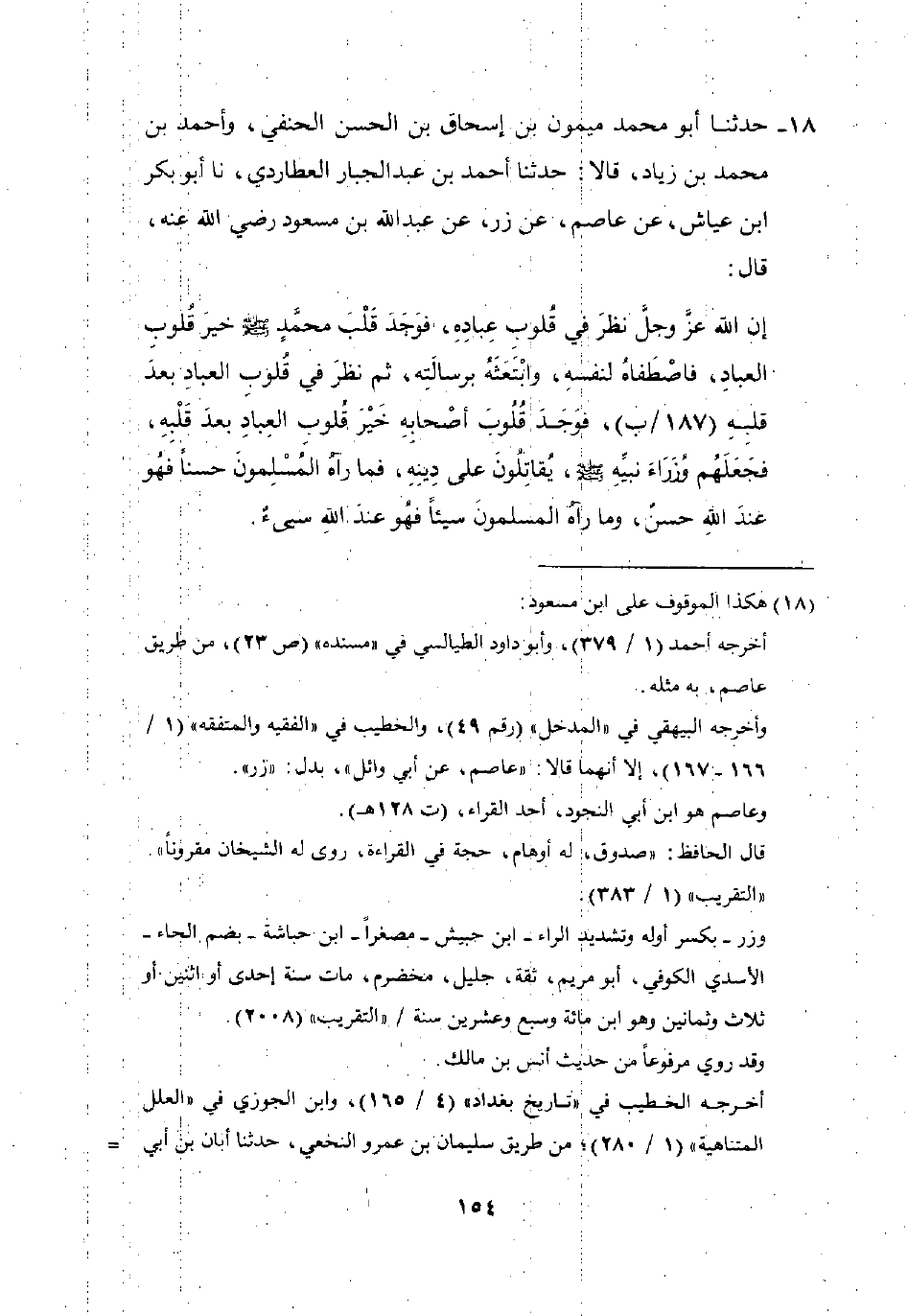 18 - حَدَّثَنَا أَبُو مُحَمَّدٍ مَيْمُونُ بْنُ إِسْحَاقَ بْنِ الْحَسَنِ الْحَنَفِيُّ وَأَحْمَدُ بْنُ مُحَمَّدِ بْنِ زِيَادٍ قَالَا: حَدَّثَنَا أَحْمَدُ بْنُ عَبْدِ الْجَبَّارِ الْعُطَارِدِيُّ، نا أَبُو بَكْرِ بْنُ عَيَّاشٍ، عَنْ عَاصِمٍ، عَنْ زِرٍّ، عَنْ عَبْدِ اللَّهِ بْنِ مَسْعُودٍ، رَضِيَ اللَّهُ عَنْهُ قَالَ: «إِنَّ اللَّهَ عَزَّ وَجَلَّ نَظَرَ فِي قُلُوبِ عِبَادِهِ فَوَجَدَ قَلْبَ مُحَمَّدٍ صَلَّى اللَّهُ عَلَيْهِ وَسَلَّمَ خَيْرَ قُلُوبِ الْعِبَادِ، فَاصْطَفَاهُ لِنَفْسِهِ، وَابْتَعَثَهُ بِرِسَالَتِهِ، ثُمَّ نَظَرَ فِي قُلُوبِ الْعِبَادِ بَعْدَ قَلْبِهِ، فَوَجَدَ قُلُوبَ أَصْحَابِهِ خَيْرَ قُلُوبِ الْعِبَادِ بَعْدَ قَلْبِهِ، فَجَعَلَهُمْ وُزَرَاءَ نَبِيِّهِ صَلَّى اللَّهُ عَلَيْهِ وَسَلَّمَ، يُقَاتِلُونَ عَلَى دِينِهِ، §فَمَا رَآهُ الْمُسْلِمُونَ حَسَنًا فَهُوَ عِنْدَ اللَّهِ حَسَنٌ، وَمَا رَآهُ الْمُسْلِمُونَ سَيِّئًا فَهُوَ عِنْدَ اللَّهِ سَيِّئٌ»