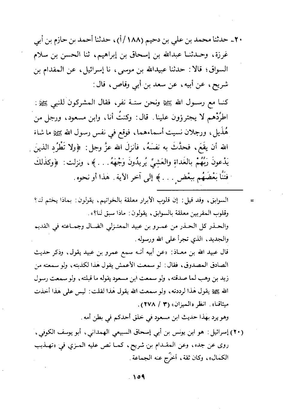 20 - حَدَّثَنَا مُحَمَّدُ بْنُ عَلِيِّ بْنِ دُحَيْمٍ، حَدَّثَنَا أَحْمَدُ بْنُ حَازِمِ بْنِ أَبِي غَرَزَةَ، وَحَدَّثَنَا عَبْدُ اللَّهِ بْنُ إِسْحَاقَ بْنِ إِبْرَاهِيمَ، ثنا الْحَسَنُ بْنُ سَلَّامٍ السَّوَّاقُ، قَالَا: حَدَّثَنَا عُبَيْدُ اللَّهِ بْنُ مُوسَى، نا إِسْرَائِيلُ، عَنِ الْمِقْدَامِ بْنِ شُرَيْحٍ، عَنْ أَبِيهِ، عَنْ سَعْدِ بْنِ أَبِي وَقَّاصٍ، قَالَ: كُنَّا مَعَ رَسُولِ اللَّهِ صَلَّى اللَّهُ عَلَيْهِ وَسَلَّمَ وَنَحْنُ سِتَّةُ نَفَرٍ، فَقَالَ الْمُشْرِكُونَ لِلنَّبِيِّ صَلَّى اللَّهُ عَلَيْهِ وَسَلَّمَ: §اطْرُدْهُمْ لَا يَجْتَرِؤُونَ عَلَيْنَا. قَالَ: وَكُنْتُ أَنَا وَابْنُ مَسْعُودٍ وَرَجُلٌ مِنْ هُذَيْلِ، وَرَجُلَانِ نَسِيتُ أَسْمَاءَهُمَا، فَوَقَعَ فِي نَفْسِ رَسُولِ اللَّهِ صَلَّى اللَّهُ عَلَيْهِ وَسَلَّمَ مَا شَاءَ اللَّهُ أَنْ يَقَعَ، فَحَدَّثَ بِهِ نَفْسَهُ، فَأَنْزَلَ اللَّهُ عَزَّ وَجَلَّ: {وَلَا تَطْرُدِ الَّذِينَ يَدْعُونَ رَبَّهُمْ بِالْغَدَاةِ} [الأنعام: 52] وَالْعَشِيِّ يُرِيدُونَ وَجْهَهُ وَنَزَلَتْ: {وَكَذَلِكَ فَتَنَّا بَعْضَهُمْ بِبَعْضٍ} [الأنعام: 53] إِلَى آخِرِ الْآيَةِ، هَذَا أَوْ نَحْوَهُ