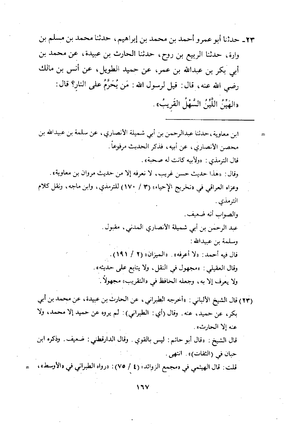 23 - حَدَّثَنَا أَبُو عَمْرٍو أَحْمَدُ بْنُ مُحَمَّدِ بْنِ إِبْرَاهِيمَ، حَدَّثَنَا مُحَمَّدُ بْنُ مُسْلِمِ بْنِ وَارَةَ، حَدَّثَنَا الرَّبِيعُ بْنُ رَوْحٍ، حَدَّثَنَا الْحَارِثُ بْنُ عُبَيْدَةَ، عَنْ مُحَمَّدِ بْنِ أَبِي بَكْرِ بْنِ عَبْدِ اللَّهِ بْنِ عُمَرَ، عَنْ حُمَيْدٍ الطَّوِيلِ، عَنْ أَنَسِ بْنِ مَالِكٍ، رَضِيَ اللَّهُ عَنْهُ قَالَ: قِيلَ لِرَسُولِ اللَّهِ: مَنْ يُحَرَّمُ عَلَى النَّارِ؟ قَالَ: §«الْهَيِّنُ اللَّيِّنُ السَّهْلُ الْقَرِيبُ»