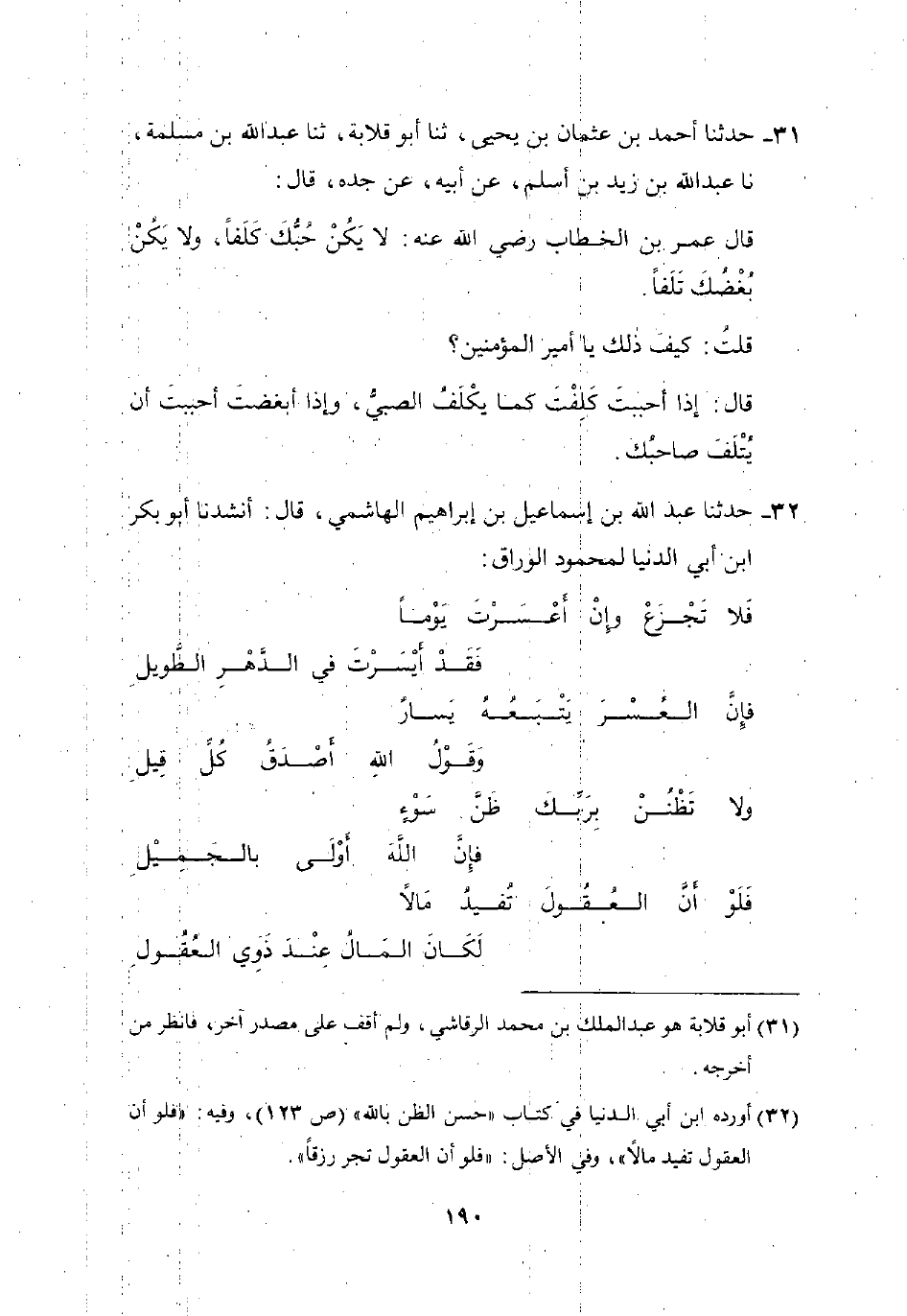 31 - حَدَّثَنَا أَحْمَدُ بْنُ عُثْمَانَ بْنِ يَحْيَى، ثنا أَبُو قِلَابَةَ، ثنا عَبْدُ اللَّهِ بْنُ مَسْلَمَةَ، نا عَبْدُ اللَّهِ بْنُ زَيْدِ بْنِ أَسْلَمَ، عَنْ أَبِيهِ، عَنْ جَدِّهِ، قَالَ: قَالَ عُمَرُ بْنُ الْخَطَّابِ رَضِيَ اللَّهُ عَنْهُ: " §لَا يَكُنْ حُبُّكَ كَلَفًا، وَلَا يَكُنْ بُغْضُكَ تَلَفًا. قُلْتُ: كَيْفَ ذَلِكَ يَا أَمِيرَ الْمُؤْمِنِينَ؟ قَالَ: إِذَا أَحْبَبْتَ كَلِفْتَ كَمَا يَكْلَفُ الصَّبِيُّ، وَإِذَا أَبْغَضْتَ أَحْبَبْتَ أَنْ يُتْلَفَ صَاحِبُكَ "