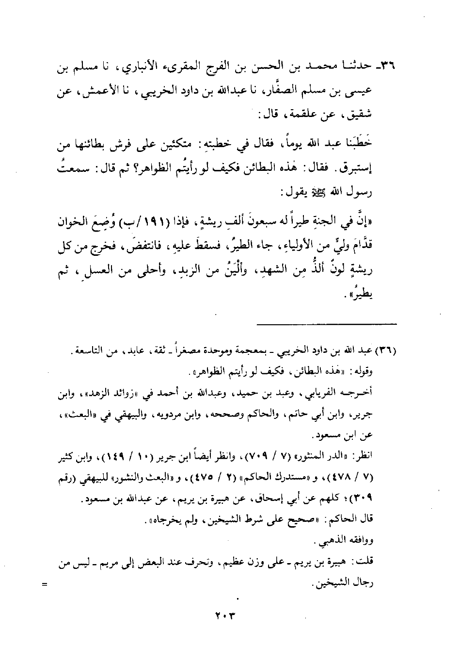 36 - حَدَّثَنَا مُحَمَّدُ بْنُ الْحَسَنِ بْنِ الْفَرَجِ الْمُقْرِئُ الْأَنْبَارِيُّ، نا مُسْلِمُ بْنُ عِيسَى بْنِ مُسْلِمٍ الصَّفَّارُ، نا عَبْدُ اللَّهِ بْنُ دَاوُدَ الْخُرَيْبِيُّ، نا الْأَعْمَشُ، عَنْ شَقِيقٍ، عَنْ عَلْقَمَةَ، قَالَ: خَطَبَنَا عَبْدُ اللَّهِ يَوْمًا فَقَالَ فِي خُطْبَتِهِ: مُتَّكِئِينَ عَلَى فُرُشٍ بَطَائِنُها مِنْ إِسْتَبْرَقٍ، فَقَالَ: هَذِهِ الْبَطَائِنُ فَكَيْفَ لَوْ رَأَيْتُمُ الظَّوَاهِرَ؟ ثُمَّ قَالَ: سَمِعْتُ رَسُولَ اللَّهِ صَلَّى اللَّهُ عَلَيْهِ وَسَلَّمَ يَقُولُ: «إِنَّ §فِي الْجَنَّةِ طَيْرًا لَهُ سَبْعُونَ أَلْفِ رِيشَةٍ، فَإِذَا وُضِعَ الْخِوَانُ قُدَّامَ وَلِيٍّ مِنَ الْأَوْلِيَاءِ جَاءَ الطَّيْرُ فَسَقَطَ عَلَيْهِ، فَانْتَفَضَ، فَخَرَجَ مِنْ كُلِّ رِيشَةٍ لَوْنٌ أَلَذُّ مِنَ الشَّهْدِ، وَأَلْيَنُ مِنَ الزُّبْدِ، وَأَحْلَى مِنَ الْعَسَلِ، ثُمَّ يَطِيرُ»