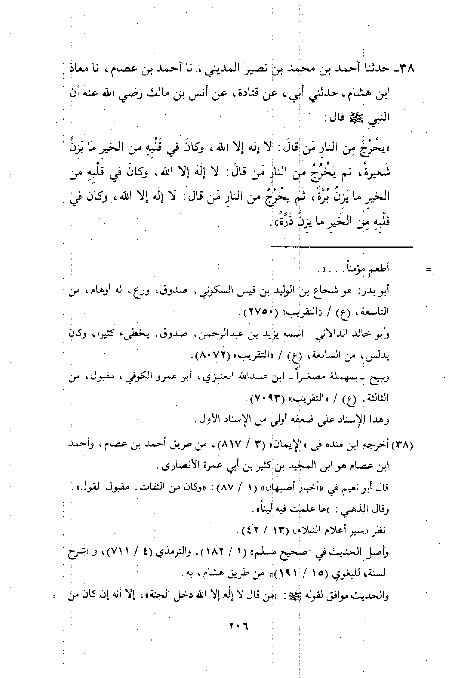 38 - حَدَّثَنَا أَحْمَدُ بْنُ مُحَمَّدِ بْنِ نُصَيْرٍ الْمَدِينِيُّ، نا أَحْمَدُ بْنُ عِصَامٍ، نا مُعَاذُ بْنُ هِشَامٍ، حَدَّثَنِي أَبِي، عَنْ قَتَادَةَ، عَنْ أَنَسِ بْنِ مَالِكٍ، رَضِيَ اللَّهُ عَنْهُ أَنَّ النَّبِيَّ صَلَّى اللَّهُ عَلَيْهِ وَسَلَّمَ قَالَ: " §يَخْرُجُ مِنَ النَّارِ مَنْ قَالَ: لَا إِلَهَ إِلَّا اللَّهُ وَكَانَ فِي قَلْبِهِ مِنَ الْخَيْرِ مَا يَزِنُ شَعِيرَةً، ثُمَّ يَخْرُجُ مِنَ النَّارِ مَنْ قَالَ: لَا إِلَهَ إِلَّا اللَّهُ وَكَانَ فِي قَلْبِهِ مِنَ الْخَيْرِ مَا يَزِنُ بُرَّةً، ثُمَّ يَخْرُجُ مِنَ النَّارِ مَنْ قَالَ: لَا إِلَهَ إِلَّا اللَّهُ وَكَانَ فِي قَلْبِهِ مِنَ الْخَيْرِ مَا يَزِنُ ذَرَّةً "