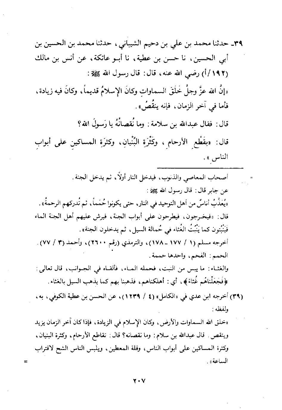 39 - حَدَّثَنَا مُحَمَّدُ بْنُ عَلِيِّ بْنِ دُحَيْمٍ الشَّيْبَانِيُّ، حَدَّثَنَا مُحَمَّدُ بْنُ الْحُسَيْنِ بْنِ أَبِي الْحُسَيْنِ، نا حَسَنُ بْنُ عَطِيَّةَ، نا أَبُو عَاتِكَةَ، عَنْ أَنَسِ بْنِ مَالِكٍ، رَضِيَ اللَّهُ عَنْهُ قَالَ: قَالَ رَسُولُ اللَّهِ صَلَّى اللَّهُ عَلَيْهِ وَسَلَّمَ: «إِنَّ اللَّهَ عَزَّ وَجَلَّ §خَلَقَ السَّمَاوَاتِ وَكَانَ الْإِسْلَامُ قَدِيمًا، وَكَانَ فِيهِ زِيَادَةٌ، فَأَمَّا فِي آخِرِ الزَّمَانِ فَإِنَّهُ يَنْقُصُ» ، قَالَ: فَقَالَ عَبْدُ اللَّهِ بْنُ سَلَامَةَ: وَمَا نُقْصَانُهُ يَا رَسُولَ اللَّهِ؟ قَالَ: «بِقَطْعِ الْأَرْحَامِ، وَكَثْرَةِ الْبُنْيَانِ، وَكَثْرَةِ الْمَسَاكِينِ عَلَى أَبْوَابِ النَّاسِ»