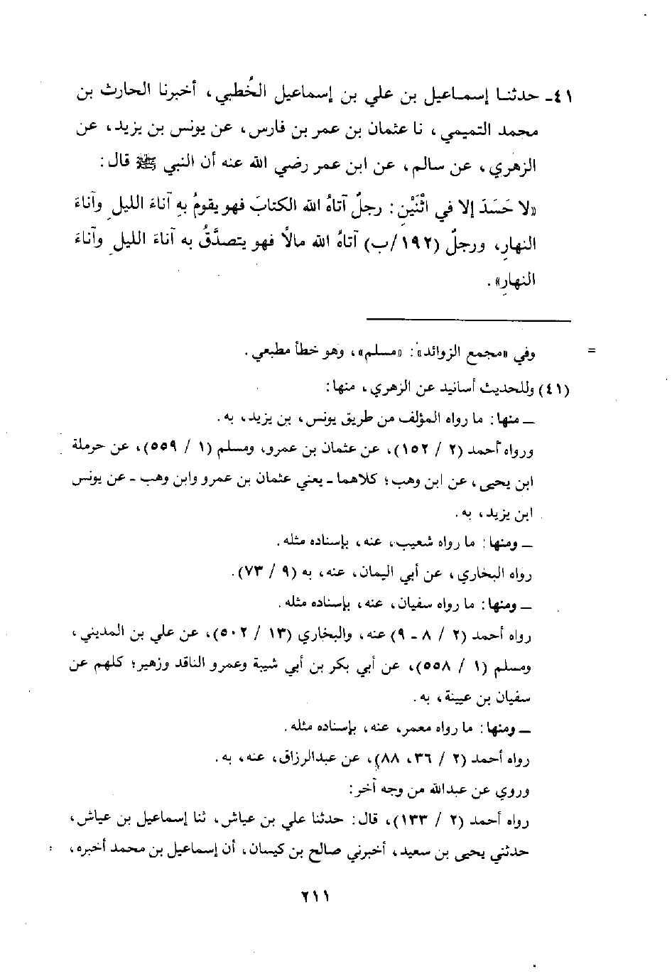 41 - حَدَّثَنَا إِسْمَاعِيلُ بْنُ عَلِيِّ بْنِ إِسْمَاعِيلَ الْخُطَبِيُّ، أَخْبَرَنَا الْحَارِثُ بْنُ مُحَمَّدٍ التَّمِيمِيُّ، نا عُثْمَانُ بْنُ عُمَرَ بْنِ فَارِسٍ، عَنْ يُونُسَ بْنِ يَزِيدَ، عَنِ الزُّهْرِيِّ عنْ سَالِمٍ، عَنِ ابْنِ عُمَرَ، رَضِيَ اللَّهُ عَنْهُ أَنَّ النَّبِيَّ صَلَّى اللَّهُ عَلَيْهِ وَسَلَّمَ قَالَ: " §لَا حَسَدَ إِلَّا فِي اثْنَيْنِ: رَجُلٌ أَتَاهُ اللَّهُ الْكِتَابَ فَهُوَ يَقُومُ بِهِ آنَاءَ اللَّيْلِ وَآنَاءَ النَّهَارِ، وَرَجُلٌ أَتَاهُ اللَّهُ مَالًا فَهُوَ يَتَصَدَّقُ بِهِ آنَاءَ اللَّيْلِ وَآنَاءَ النَّهَارِ "