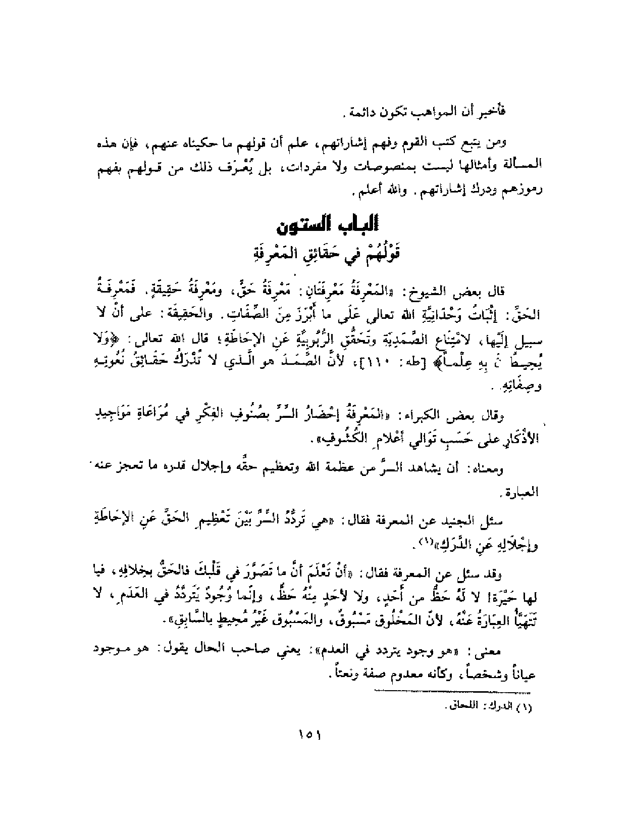 تنبيههم اياهم بالفراسات قَالَ أَبُو الْعَبَّاس بن الْمُهْتَدي كنت فِي الْبَادِيَة فَرَأَيْت رجلا يمشي بَين يَدي حافي الْقدَم حاسر الرَّأْس لَيْسَ مَعَه ركوة فَقلت فِي نَفسِي كَيفَ يُصَلِّي هَذَا الرجل مَا لهَذَا طَهَارَة وَلَا صَلَاة قَالَ فَالْتَفت إِلَى فَقَالَ {يعلم مَا فِي أَنفسكُم فَاحْذَرُوهُ} قَالَ فَسَقَطت مغشيا عَليّ قَالَ فَلَمَّا أَفَقْت استغفرت الله من تِلْكَ الرُّؤْيَة الَّتِي نظرت بهَا إِلَيْهِ فَبينا أَنا أَمْشِي فِي بعض الطَّرِيق فَإِذا هُوَ بَين يَدي فَلَمَّا رَأَيْته هِبته وتوقفت فَالْتَفت إِلَى ثمَّ قَرَأَ {وَهُوَ الَّذِي يقبل التَّوْبَة عَن عباده وَيَعْفُو عَن السَّيِّئَات} قَالَ ثمَّ غَابَ فَمَا رَأَيْته بعد ذَلِك أَو كَمَا قَالَ