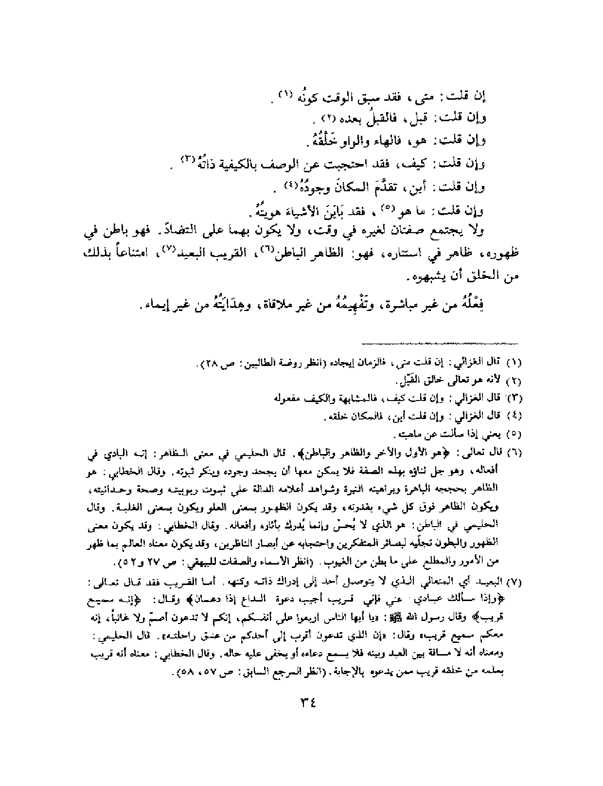 لَيْسَ بجسم وَلَا شبح وَلَا صُورَة وَلَا شخص وَلَا جَوْهَر وَلَا عرض لَا اجْتِمَاع لَهُ وَلَا افْتِرَاق لَا يَتَحَرَّك وَلَا يسكن وَلَا ينقص وَلَا يزْدَاد لَيْسَ بِذِي أبعاض وَلَا أَجزَاء وَلَا جوارح وَلَا أَعْضَاء وَلَا بِذِي جِهَات وَلَا أَمَاكِن لَا تجْرِي عَلَيْهِ الْآفَات وَلَا تاخذه السنات وَلَا تداوله الْأَوْقَات وَلَا تعينه الإشارات لَا يحويه مَكَان وَلَا يجْرِي عله زمَان لَا تجوز عَلَيْهِ المماسة وَلَا الْعُزْلَة وَلَا الْحُلُول فِي الْأَمَاكِن لَا تحيط بِهِ الأفكار وَلَا تحجبه الأستار وَلَا تُدْرِكهُ الْأَبْصَار