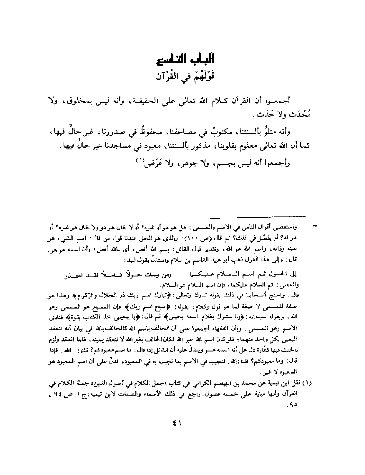 وَالْقُرْآن إِذا أرسل وَأطلق لم يفهم مِنْهُ غير كَلَام الله تَعَالَى فَهُوَ إِذا غير مَخْلُوق وَالْوَقْف فِيهِ لأحد أَمريْن إِمَّا أَن يقف فِيهِ وَهُوَ يصفه بِصفة الْمُحدث والمخلوق فَهُوَ عِنْده مَخْلُوق ووقوفه تقية أَو يقف وَهُوَ منطو على أَنه صفة لله فِي ذَاته فَلَا معنى لوقوفه عَن عبارَة الْخلق والنطق بِهِ اللَّهُمَّ إِلَّا أَن ينطوي على أَنه صفة لله وصفات الله غير مخلوقة وَلم يمْتَحن بناف يجب عَلَيْهِ إثْبَاته فَيَقُول الْقُرْآن كَلَام الله ويسكت إِذْ لم يَأْتِ بِغَيْر مَخْلُوق رِوَايَة وَلَا تليت بِهِ آيَة فَهُوَ عِنْد ذَلِك مُصِيب