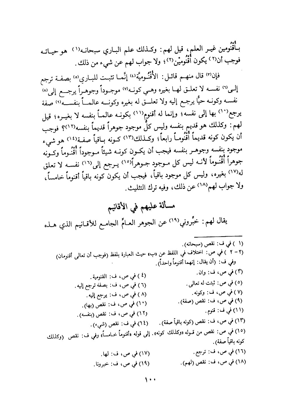 فَإِن قَالَ مِنْهُم قَائِل الأقنومية إِنَّمَا ثَبت للباري بِصفة ترجع إِلَى نَفسه لَا تعلق لَهَا بِغَيْرِهِ وَهِي كَونه مَوْجُودا وجوهرا يرجع إِلَى نَفسه وَكَونه حَيا يرجع إِلَيْهِ وَلَا تعلق لَهُ بِغَيْرِهِ وَكَونه عَالما بِنَفسِهِ صفة يرجع بهَا إِلَى نَفسه وَإِنَّمَا لَهُ أقنوم بِكَوْنِهِ عَالما بِنَفسِهِ لَا بِغَيْرِهِ قيل لَهُم وَكَذَلِكَ هُوَ قديم بِنَفسِهِ وَلَيْسَ كل مَوْجُود جوهرا قَدِيما بِنَفسِهِ فَوَجَبَ أَن يكون كَونه قَدِيما أقنوما رَابِعا وَكَذَلِكَ كَونه بَاقِيا صفة هُوَ شَيْء مَوْجُود بِنَفسِهِ وجوهر بِنَفسِهِ فَيجب أَن يكون كَونه شَيْئا مَوْجُودا أقنوما وَكَونه جوهرا أقنوما لِأَنَّهُ لَيْسَ كل مَوْجُود جوهرا يرجع إِلَى نَفسه لَا تعلق لَهُ بِغَيْرِهِ وَلَيْسَ كل مَوْجُود بَاقِيا فَيجب أَن يكون كَونه بَاقِيا أقنوما خَامِسًا وَلَا جَوَاب لَهُم عَن ذَلِك وَفِيه ترك التَّثْلِيث