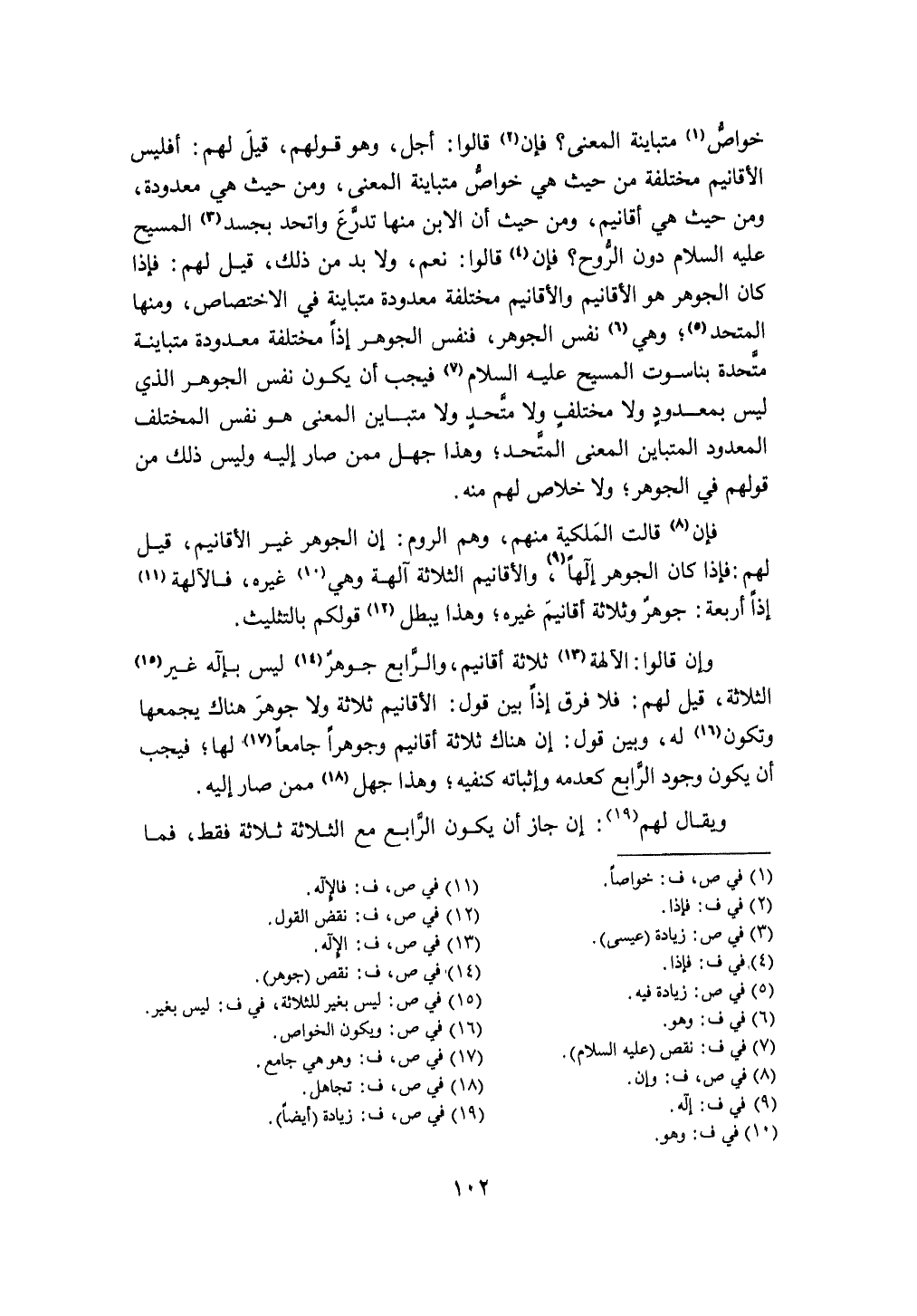 خَواص متباينة الْمَعْنى فَإِن قَالُوا أجل وَهُوَ قَوْلهم قيل لَهُم أفليس الأقانيم مُخْتَلفَة من حَيْثُ هِيَ خَواص متباينة الْمَعْنى وَمن حَيْثُ هِيَ مَعْدُودَة وَمن حَيْثُ هِيَ أقانيم وَمن حَيْثُ أَن الابْن مِنْهَا تدرع واتحد بجسد الْمَسِيح عَلَيْهِ السَّلَام دون الرّوح فَإِن قَالُوا نعم وَلَا بُد من ذَلِك قيل لَهُم فَإِذا كَانَ الْجَوْهَر هُوَ الأقانيم والأقانيم مُخْتَلفَة مَعْدُودَة متباينة فِي الِاخْتِصَاص وَمِنْهَا المتحد وَهِي نفس الْجَوْهَر فَنَفْس الْجَوْهَر إِذا مُخْتَلفَة مَعْدُودَة متباينة متحدة بناسوت الْمَسِيح عَلَيْهِ السَّلَام فَيجب أَن يكون نفس الْجَوْهَر الَّذِي لَيْسَ بمعدود وَلَا مُخْتَلف وَلَا مُتحد وَلَا متباين الْمَعْنى هُوَ نفس الْمُخْتَلف الْمَعْدُود المتباين الْمَعْنى المتحد وَهَذَا جهل مِمَّن صَار إِلَيْهِ وَلَيْسَ ذَلِك من قَوْلهم فِي الْجَوْهَر وَلَا خلاص لَهُم مِنْهُ