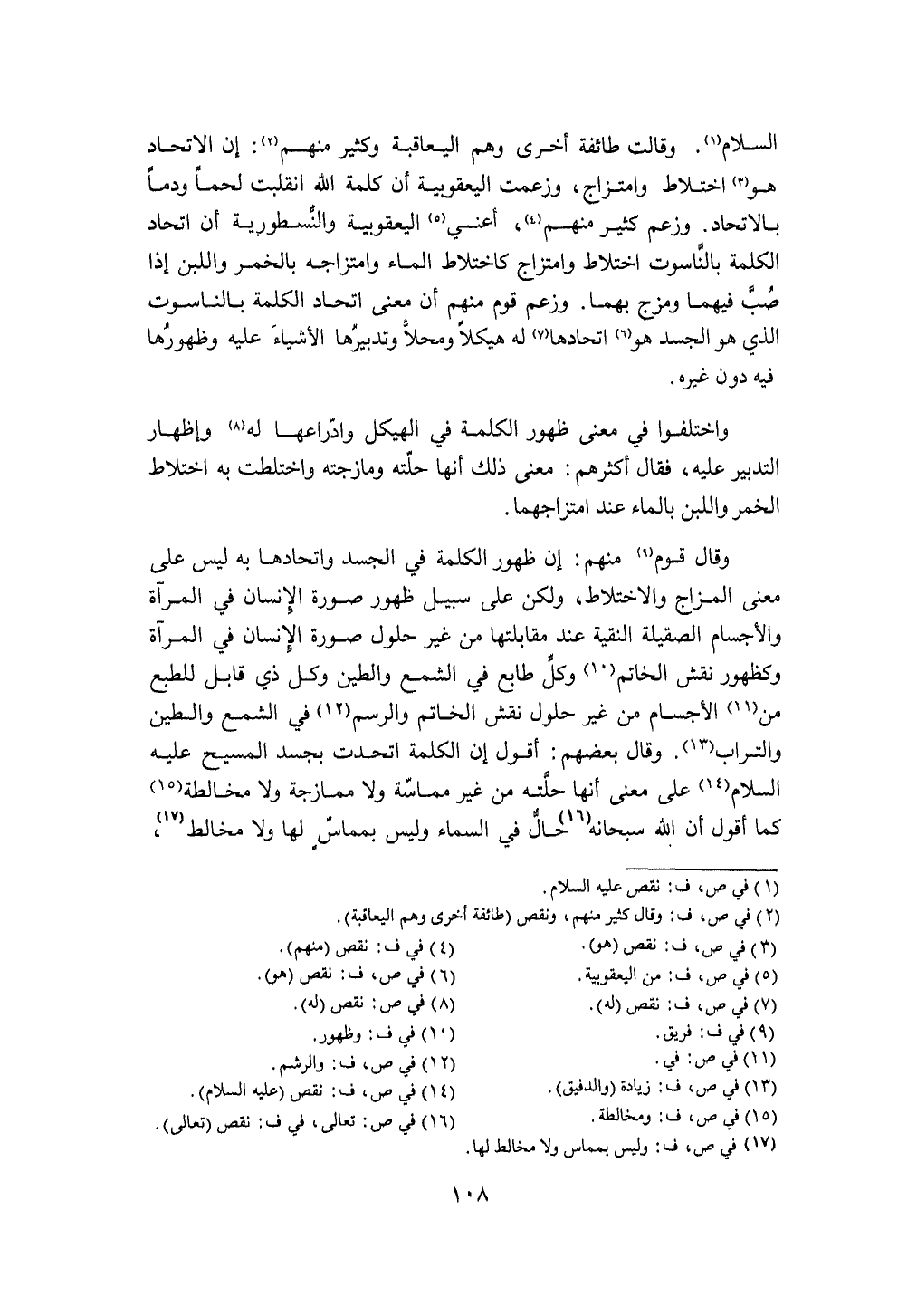 وَزعم كثير مِنْهُم أَعنِي اليعقوبية والنسطورية أَن اتِّحَاد الْكَلِمَة بالناسوت اخْتِلَاط وامتزاج كاختلاط المَاء وامتزاجه بِالْخمرِ وَاللَّبن إِذا صب فيهمَا ومزج بهما