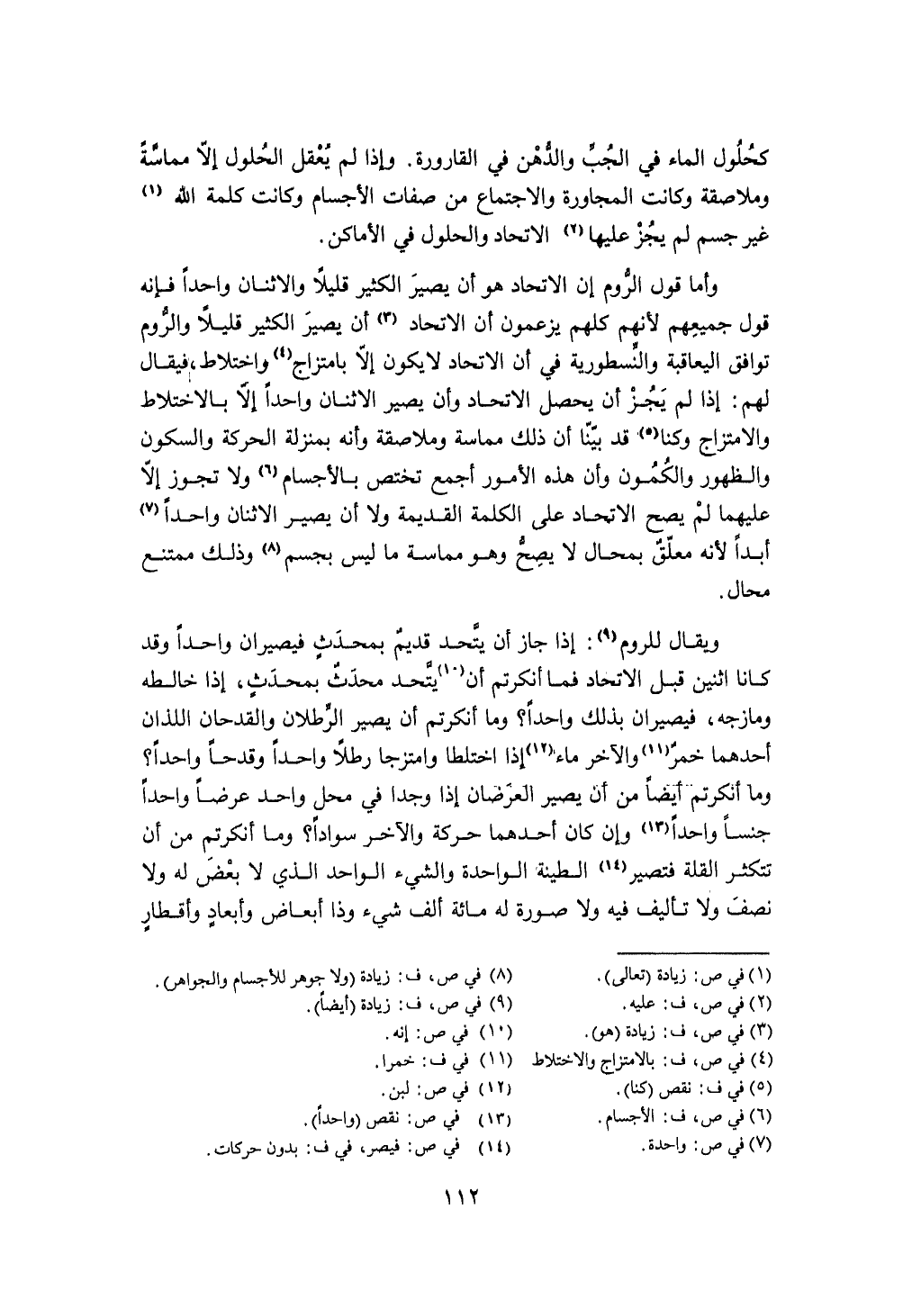 وَأما قَول الرّوم إِن الِاتِّحَاد هُوَ أَن يصير الْكثير قَلِيلا والاثنان وَاحِدًا فَإِنَّهُ قَول جَمِيعهم لأَنهم كلهم يَزْعمُونَ أَن الِاتِّحَاد أَن يصير الْكثير قَلِيلا وَالروم توَافق اليعاقبة والنسطورية فِي أَن الِاتِّحَاد لَا يكون إِلَّا بامتزاج واختلاط فَيُقَال لَهُم إِذا لم يجز أَن يحصل الِاتِّحَاد وَأَن يصير الِاثْنَان وَاحِدًا إِلَّا بالاختلاط والامتزاج وَكُنَّا قد بَينا أَن ذَلِك مماسة وملاصقة وَأَنه بِمَنْزِلَة الْحَرَكَة والسكون والظهور والكمون وَأَن هَذِه الْأُمُور أجمع تخْتَص بالأجسام وَلَا تجوز إِلَّا عَلَيْهِمَا لم يَصح الِاتِّحَاد على الْكَلِمَة الْقَدِيمَة وَلَا أَن يصير الِاثْنَان وَاحِدًا أبدا لِأَنَّهُ مُعَلّق بمحال لَا يَصح وَهُوَ مماسة مَا لَيْسَ بجسم وَذَلِكَ مُمْتَنع محَال