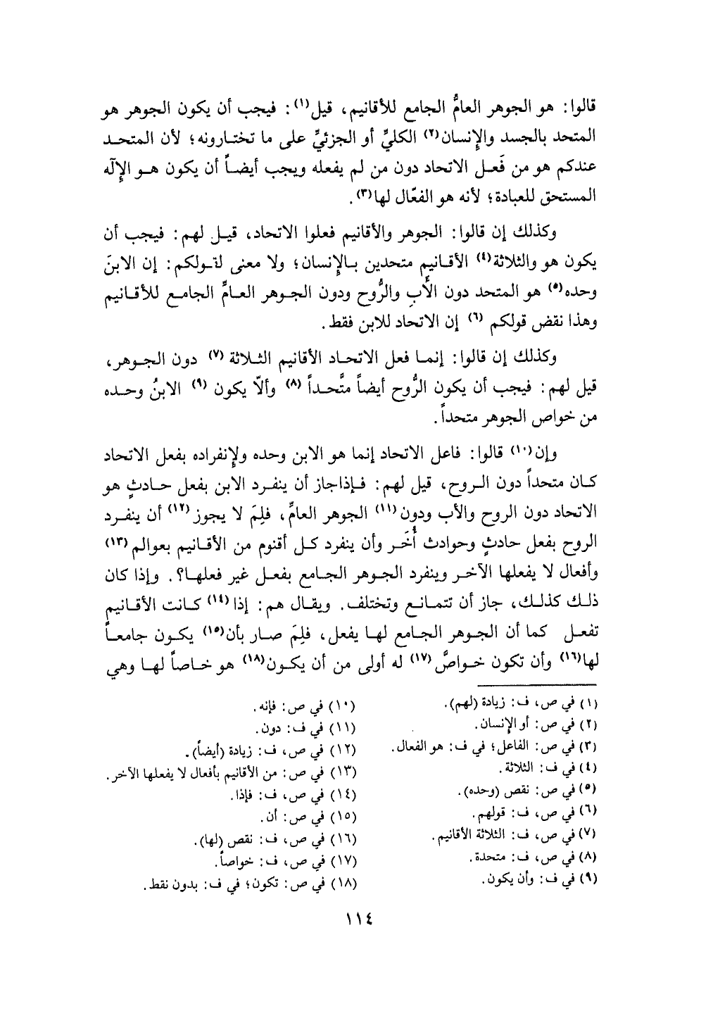قَالُوا هُوَ الْجَوْهَر الْعَام الْجَامِع للأقانيم قيل فَيجب أَن يكون الْجَوْهَر هُوَ المتحد بالجسد وَالْإِنْسَان الْكُلِّي أَو الجزئي على مَا تختارونه لِأَن المتحد عنْدكُمْ هُوَ من فعل الِاتِّحَاد دون من لم يَفْعَله وَيجب أَيْضا أَن يكون هُوَ الْإِلَه الْمُسْتَحق لِلْعِبَادَةِ لِأَنَّهُ هُوَ الفعال لَهَا