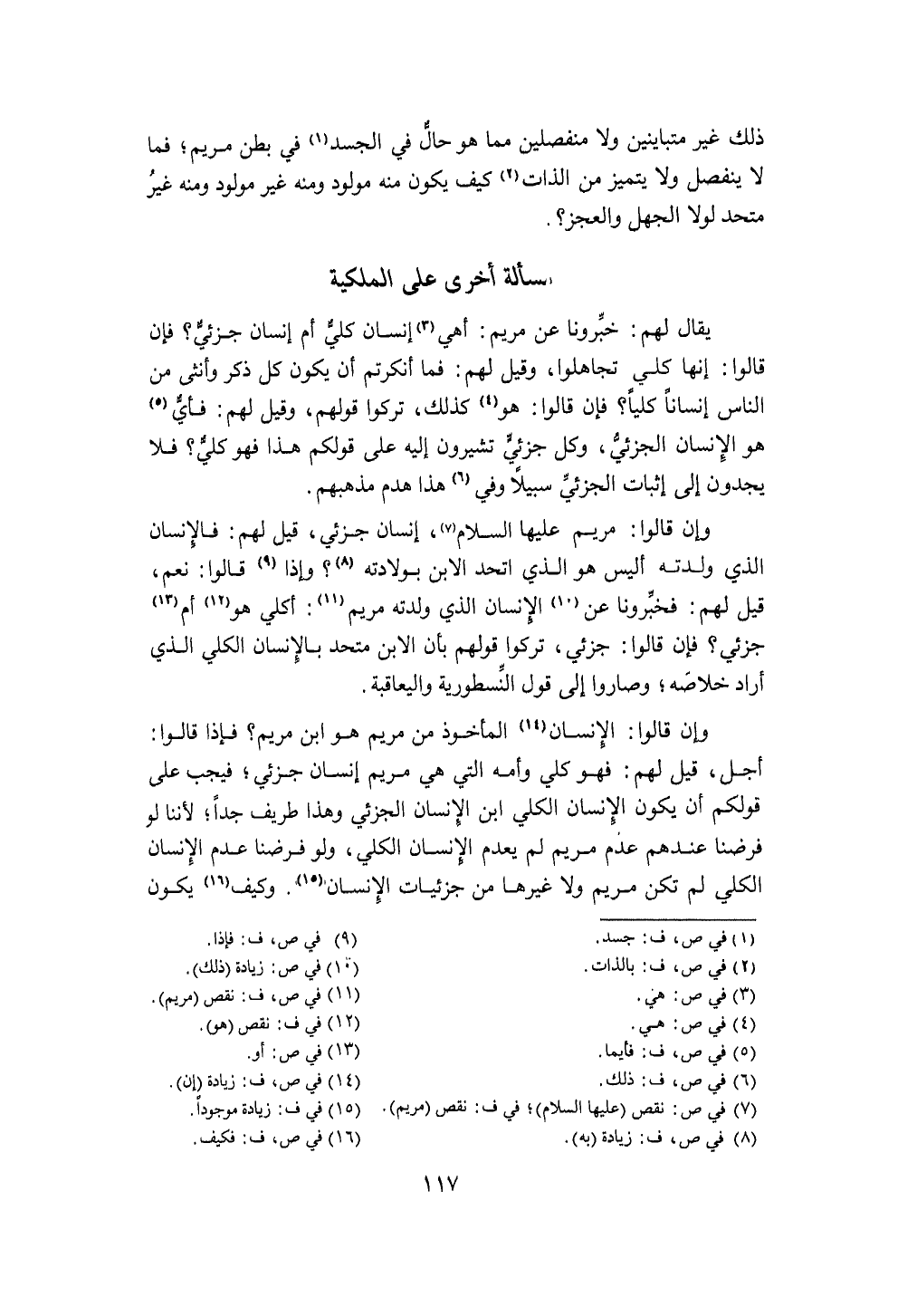 وَإِن قَالُوا مَرْيَم عَلَيْهَا السَّلَام إِنْسَان جزئي قيل لَهُم فالإنسان الَّذِي وَلدته أَلَيْسَ هُوَ الَّذِي اتَّحد الابْن بولادته وَإِذا قَالُوا نعم قيل لَهُم فخبرونا عَن الْإِنْسَان الَّذِي وَلدته مَرْيَم أكلي هُوَ أم جزئي فَإِن قَالُوا جزئي تركُوا قَوْلهم بِأَن الابْن مُتحد بالإنسان الْكُلِّي الَّذِي أَرَادَ خلاصه وصاروا إِلَى قَول النسطورية واليعاقبة