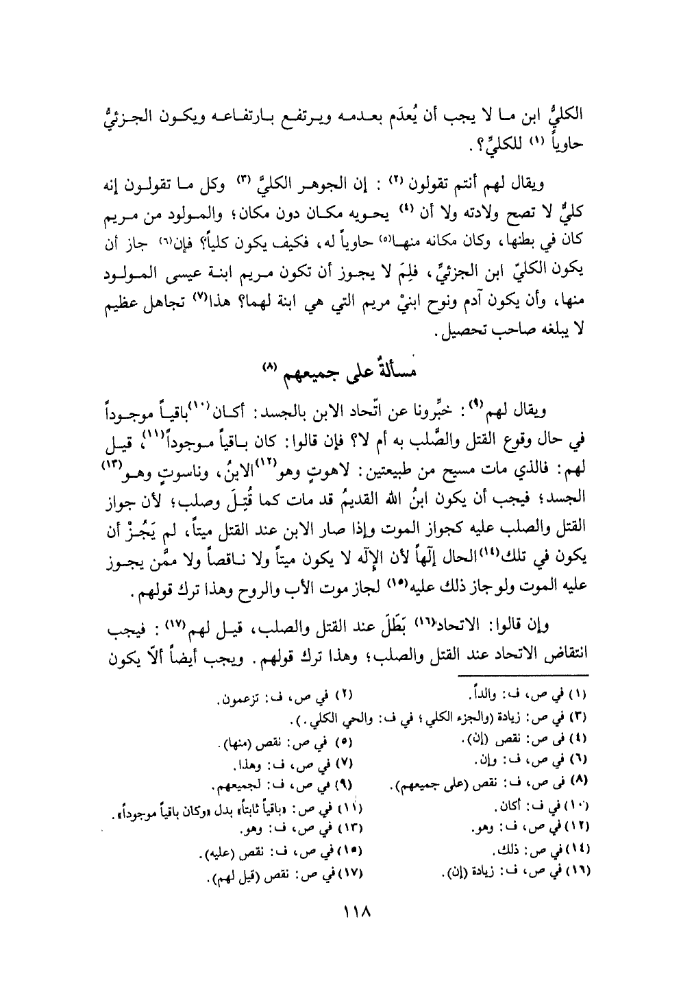وَيُقَال لَهُم أَنْتُم تَقولُونَ إِن الْجَوْهَر الْكُلِّي وكل مَا تَقولُونَ إِنَّه كلي لَا تصح وِلَادَته وَلَا أَن يحويه مَكَان دون مَكَان والمولود من مَرْيَم كَانَ فِي بَطنهَا وَكَانَ مَكَانَهُ مِنْهَا حاويا لَهُ فَكيف يكون كليا فَإِن جَازَ أَن يكون الْكُلِّي ابْن الجزئي فَلم لَا يجوز أَن تكون مَرْيَم ابْنة عِيسَى الْمَوْلُود مِنْهَا وَأَن يكون آدم ونوح ابْني مَرْيَم الَّتِي هِيَ ابْنة لَهما هَذَا تجاهل عَظِيم لَا يبلغهُ صَاحب تَحْصِيل