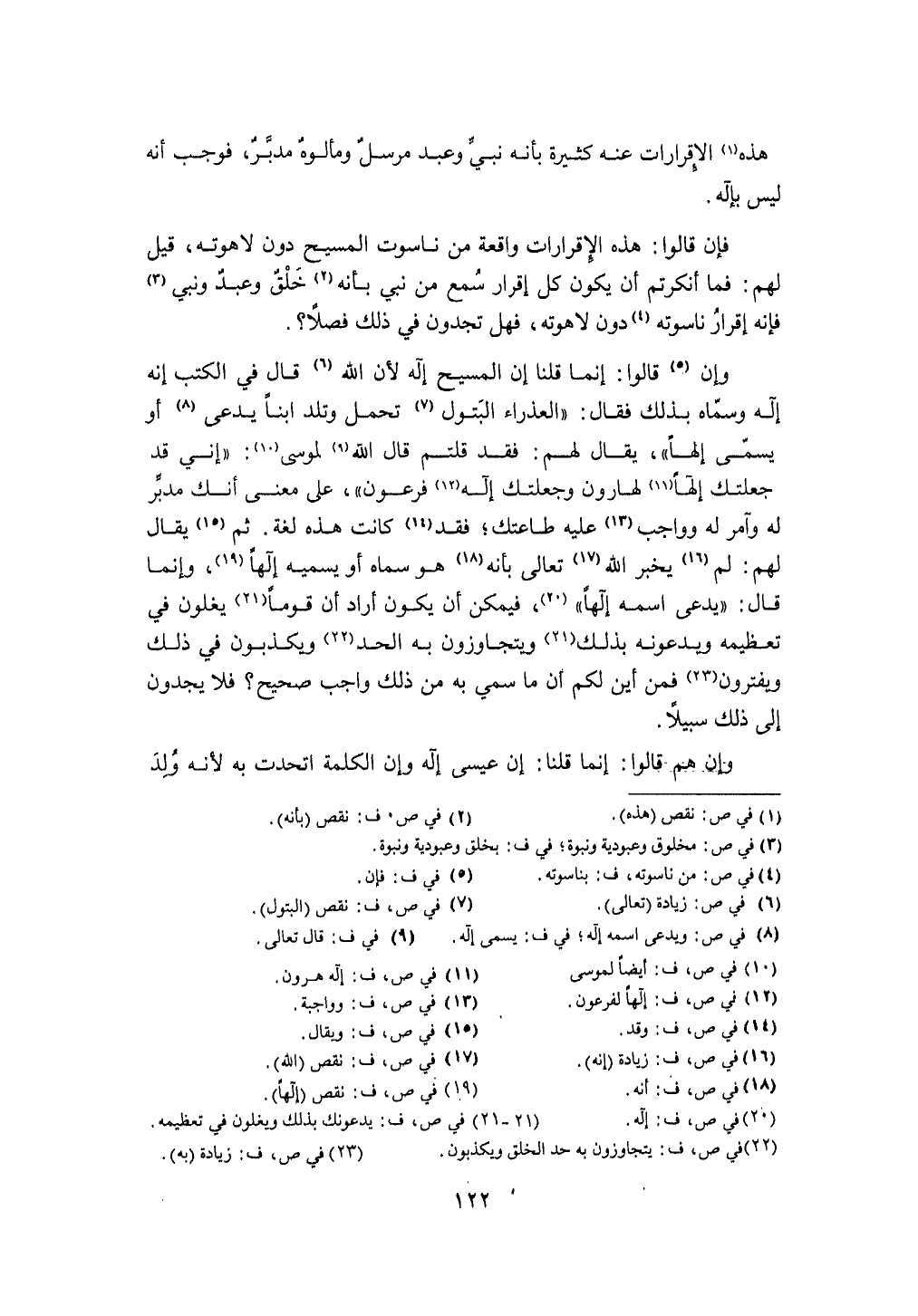 فَإِن قَالُوا هَذِه الإقرارات وَاقعَة من ناسوت الْمَسِيح دون لاهوته قيل لَهُم فَمَا أنكرتم أَن يكون كل إِقْرَار سمع من نَبِي بِأَنَّهُ خلق وَعبد وَنَبِي فَإِنَّهُ إِقْرَار ناسوته دون لاهوته فَهَل تَجِدُونَ فِي ذَلِك فصلا