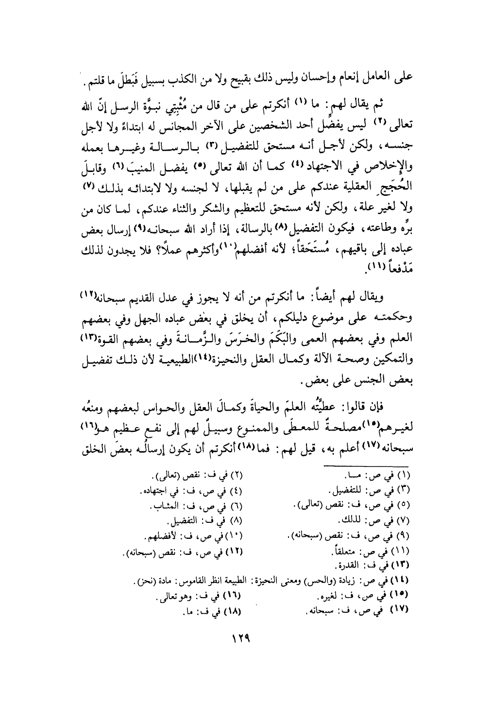 ثمَّ يُقَال لَهُم مَا أنكرتم على من قَالَ من مثبتي نبوة الرُّسُل إِن الله تَعَالَى لَيْسَ يفضل أحد الشخصين على الآخر المجانس لَهُ ابْتِدَاء وَلَا لأجل جنسه وَلَكِن لأجل أَنه مُسْتَحقّ للتفضيل بالرسالة وَغَيرهَا بِعَمَلِهِ وَالْإِخْلَاص فِي الِاجْتِهَاد كَمَا أَن الله تَعَالَى يفضل الْمُنِيب وقابل الْحجَج الْعَقْلِيَّة عنْدكُمْ على من لم يقبلهَا لَا لجنسه وَلَا لابتدائه بذلك وَلَا لغير عِلّة وَلَكِن لِأَنَّهُ مُسْتَحقّ للتعظيم وَالشُّكْر وَالثنَاء عنْدكُمْ لما كَانَ من بره وطاعته فَيكون التَّفْضِيل بالرسالة إِذا أَرَادَ الله سُبْحَانَهُ إرْسَال بعض عباده إِلَى باقيهم مُسْتَحقّا لِأَنَّهُ أفضلهم وَأَكْثَرهم عملا فَلَا يَجدونَ لذَلِك مدفعا