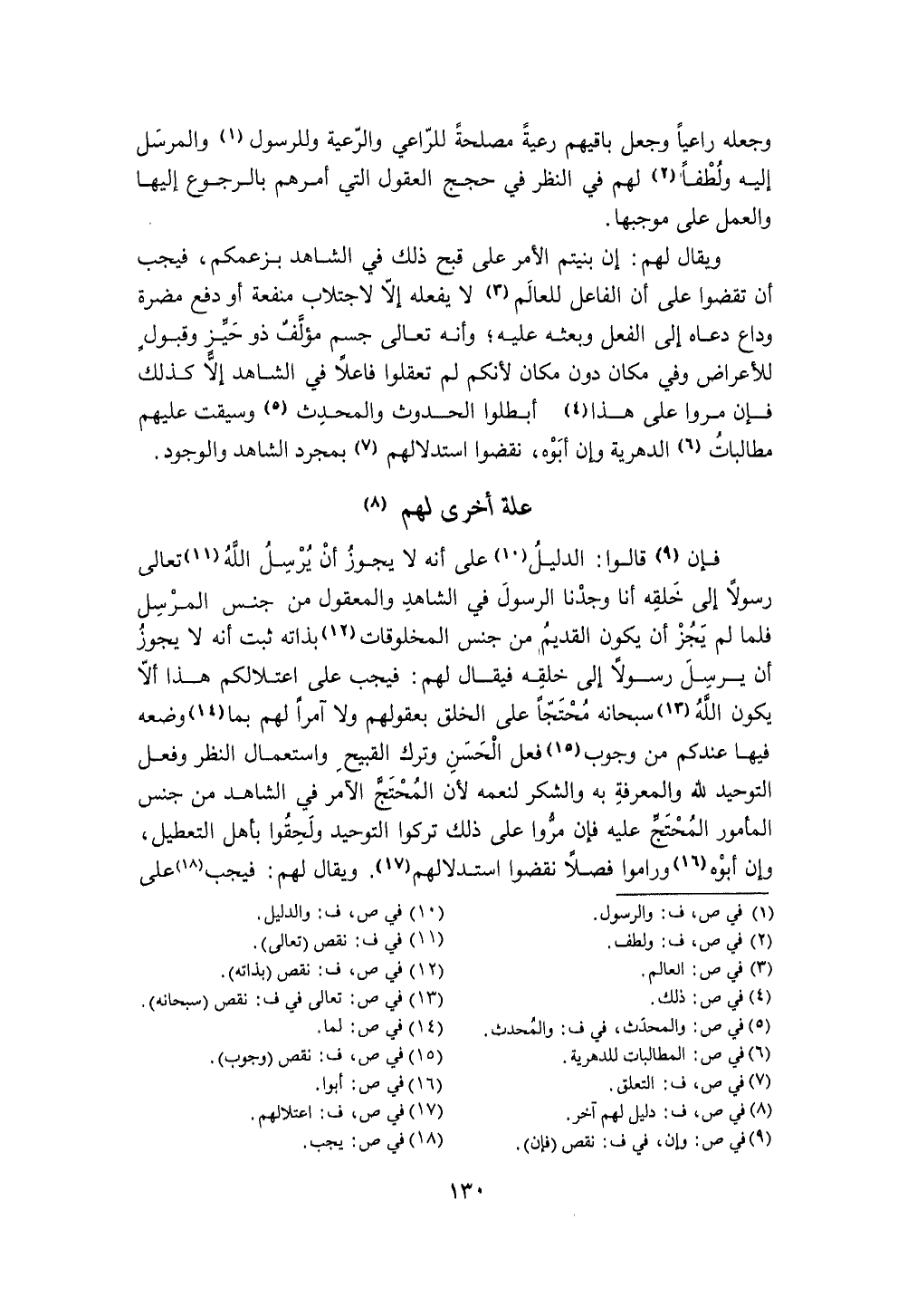 وَيُقَال لَهُم إِن بنيتم الْأَمر على قبح ذَلِك فِي الشَّاهِد بزعمكم فَيجب أَن تقضوا على أَن الْفَاعِل للْعَالم لَا يَفْعَله إِلَّا لاجتلاب مَنْفَعَة أَو دفع مضرَّة وداع دَعَاهُ إِلَى الْفِعْل وَبَعثه عَلَيْهِ وَأَنه تَعَالَى جسم مؤلف ذُو حيّز وَقبُول للأعراض وَفِي مَكَان دون مَكَان لأنكم لم تعقلوا فَاعِلا فِي الشَّاهِد إِلَّا كَذَلِك فَإِن مروا على هَذَا أبطلوا الْحُدُوث والمحدث وسيقت عَلَيْهِم مطالبات الدهرية وَإِن أَبوهُ نقضوا استدلالهم بِمُجَرَّد الشَّاهِد والوجود