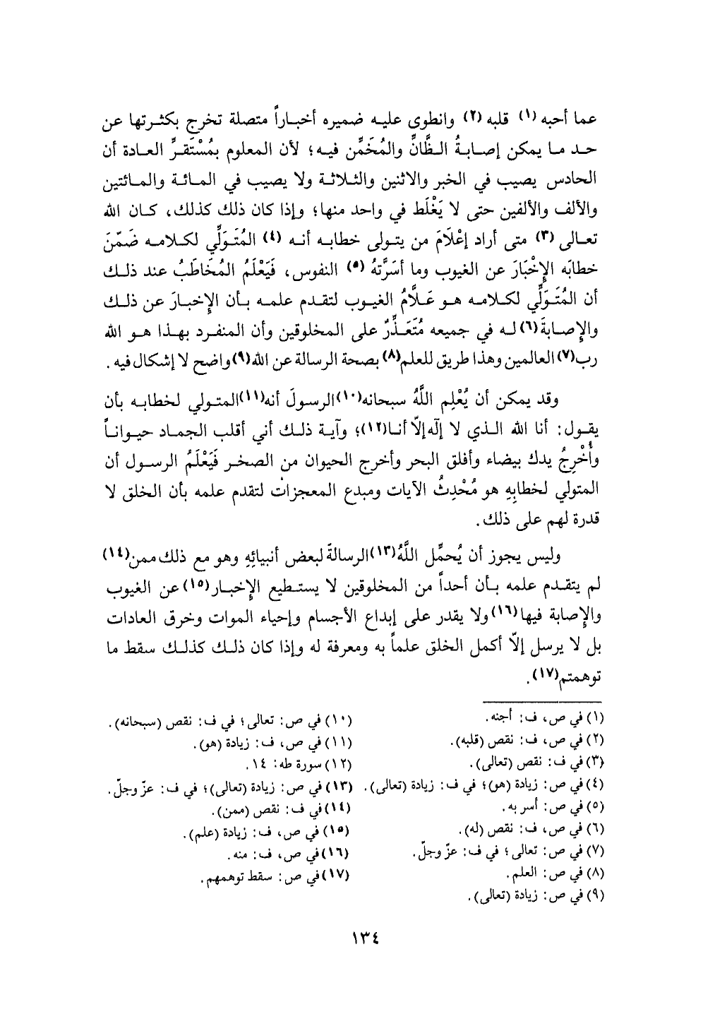 عَمَّا أحبه قلبه وانطوى عَلَيْهِ ضَمِيره أَخْبَارًا مُتَّصِلَة تخرج بكثرتها عَن حد مَا يُمكن إِصَابَة الظَّان والمخمن فِيهِ لِأَن الْمَعْلُوم بمستقر الْعَادة أَن الحادس يُصِيب فِي الْخَبَر والاثنين وَالثَّلَاثَة وَلَا يُصِيب فِي الْمِائَة والمائتين وَالْألف والألفين حَتَّى لَا يغلط فِي وَاحِد مِنْهَا وَإِذا كَانَ ذَلِك كَذَلِك كَانَ الله تَعَالَى مَتى أَرَادَ إِعْلَام من يتَوَلَّى خطابه أَنه الْمُتَوَلِي لكَلَامه ضمن خطابه الْإِخْبَار عَن الغيوب وَمَا أسرته النُّفُوس فَيعلم الْمُخَاطب عِنْد ذَلِك أَن الْمُتَوَلِي لكَلَامه هُوَ علام الغيوب لتقدم علمه بِأَن الْإِخْبَار عَن ذَلِك والإصابة لَهُ فِي جَمِيعه مُتَعَذر على المخلوقين وَأَن الْمُنْفَرد بِهَذَا هُوَ الله رب الْعَالمين وَهَذَا طَرِيق للْعلم بِصِحَّة الرسَالَة عَن الله وَاضح لَا إِشْكَال فِيهِ
