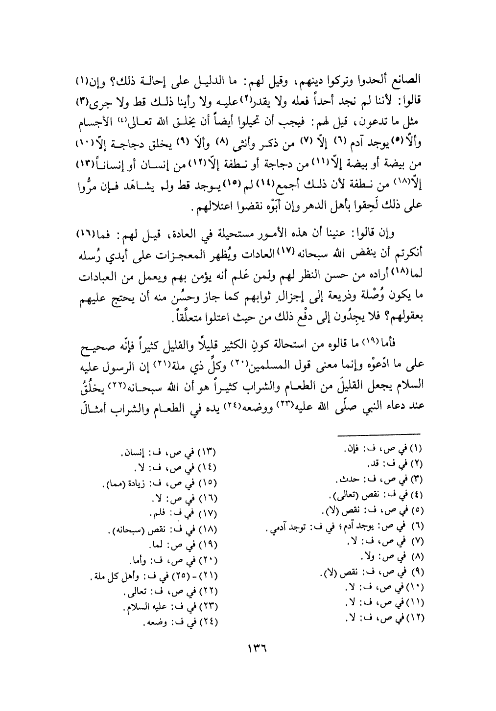 الصَّانِع ألحدوا وَتركُوا دينهم وَقيل لَهُم مَا الدَّلِيل على إِحَالَة ذَلِك وَإِن قَالُوا لأننا لم نجد أحدا فعله وَلَا يقدر عَلَيْهِ وَلَا رَأينَا ذَلِك قطّ وَلَا جرى مثل مَا تدعون قيل لَهُم فَيجب أَن تحيلوا أَيْضا أَن يخلق الله تَعَالَى الْأَجْسَام وَألا يُوجد آدم إِلَّا من ذكر وَأُنْثَى وَألا يخلق دجَاجَة إِلَّا من بَيْضَة أَو بَيْضَة إِلَّا من دجَاجَة أَو نُطْفَة إِلَّا من إِنْسَان أَو إنْسَانا إِلَّا من نطقة لِأَن ذَلِك أجمع لم يُوجد قطّ وَلم يُشَاهد فَإِن مروا على ذَلِك لَحِقُوا بِأَهْل الدَّهْر وَإِن أَبوهُ نقضوا اعتلالهم
