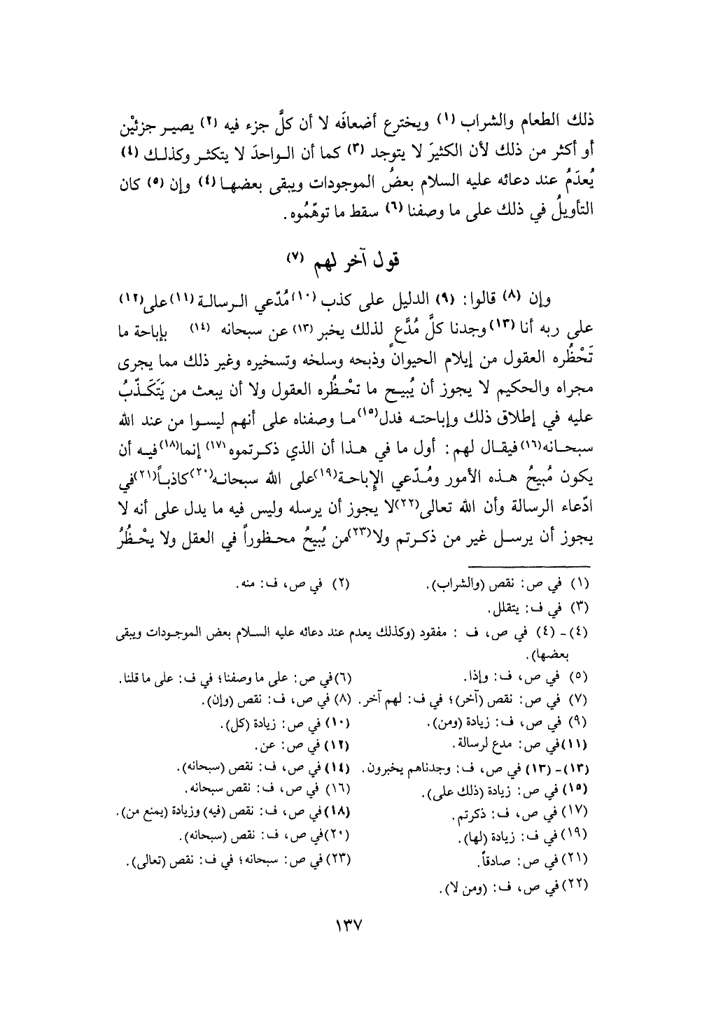 ذَلِك الطَّعَام وَالشرَاب ويخترع أضعافه لَا أَن كل جُزْء فِيهِ يصير جزئين أَو أَكثر من ذَلِك لِأَن الْكثير لَا يتوجد كَمَا أَن الْوَاحِد لَا يتكثر وَكَذَلِكَ يعْدم عِنْد دُعَائِهِ عَلَيْهِ السَّلَام بعض الموجودات وَيبقى بَعْضهَا وَإِن كَانَ التَّأْوِيل فِي ذَلِك على مَا وَصفنَا سقط مَا توهموه