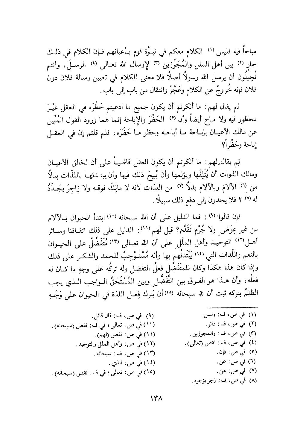 مُبَاحا فِيهِ فَلَيْسَ الْكَلَام مَعكُمْ فِي نبوة قوم بأعيانهم فَإِن الْكَلَام فِي ذَلِك جَار بَين أهل الْملَل والمجوزين لإرسال الله تَعَالَى الرُّسُل وَأَنْتُم تحيلون أَن يُرْسل الله رَسُولا أصلا فَلَا معنى للْكَلَام فِي تعْيين رِسَالَة فلَان دون فلَان فَإِنَّهُ خُرُوج عَن الْكَلَام وَعجز وانتقال من بَاب إِلَى بَاب