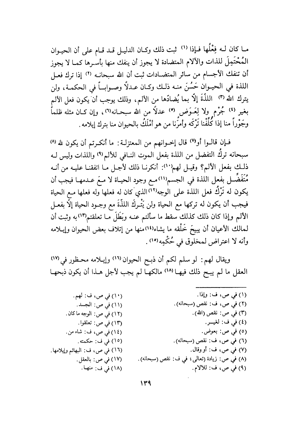 مَا كَانَ لَهُ فعلهَا فَإِذا ثَبت ذَلِك وَكَانَ الدَّلِيل قد قَامَ على أَن الْحَيَوَان الْمُحْتَمل للذات والآلام المتضادة لَا يجوز أَن يَنْفَكّ مِنْهَا بأسرها كَمَا لَا يجوز أَن تنفك الْأَجْسَام من سَائِر المتضادات ثَبت أَن الله سُبْحَانَهُ إِذا ترك فعل اللَّذَّة فِي الْحَيَوَان حسن مِنْهُ ذَلِك وَكَانَ عدلا وصوابا فِي الْحِكْمَة وَلنْ يتْرك الله اللَّذَّة إِلَّا بِمَا يضادها من الْأَلَم وَذَلِكَ يُوجب أَن يكون فعل الْأَلَم بِغَيْر جرم وَلَا لعوض عدلا من الله سُبْحَانَهُ وَإِن كَانَ مثله ظلما وجورا منا إِذا كلفنا تَركه وأمرنا من هُوَ أملك بِالْحَيَوَانِ منا بترك إيلامه