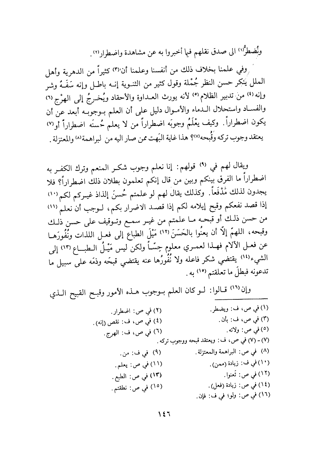 وَفِي علمنَا بِخِلَاف ذَلِك من أَنْفُسنَا وَعلمنَا أَن كثيرا من الدهرية وَأهل الْملَل يُنكر حسن النّظر جملَة وَقَول كثير من الثنوية إِنَّه بَاطِل وَإنَّهُ سفه وَشر وَإنَّهُ من تَدْبِير الظلام لِأَنَّهُ يُورث الْعَدَاوَة والأحقاد وَيخرج إِلَى الْهَرج وَالْفساد وَاسْتِحْلَال الدِّمَاء وَالْأَمْوَال دَلِيل على أَن الْعلم بِوُجُوبِهِ أبعد عَن أَن يكون اضطرارا