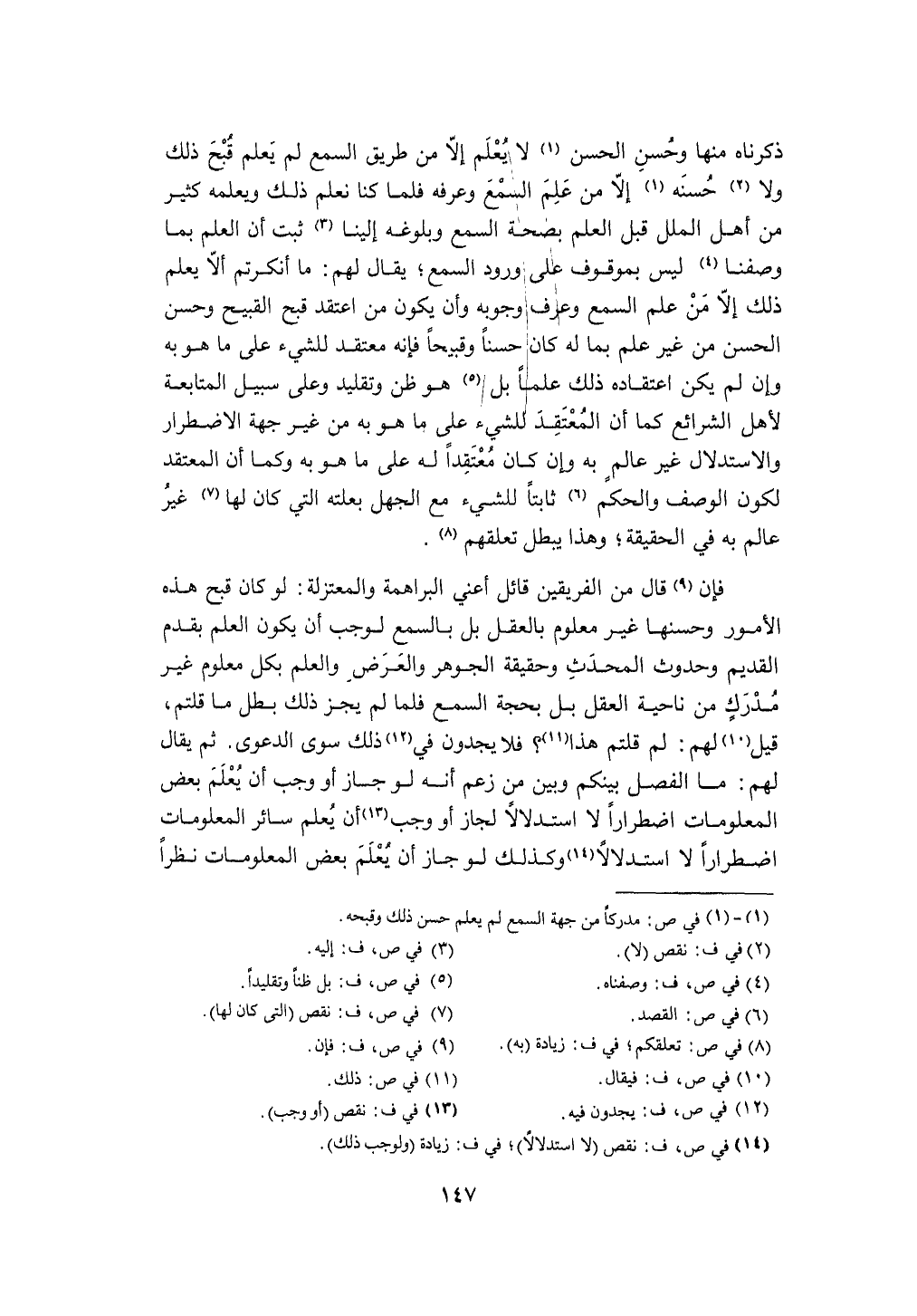 فَإِن قَالَ من الْفَرِيقَيْنِ قَائِل أَعنِي البراهمة والمعتزلة لَو كَانَ قبح هَذِه الْأُمُور وحسنها غير مَعْلُوم بِالْعقلِ بل بِالسَّمْعِ لوَجَبَ أَن يكون الْعلم بقدم الْقَدِيم وحدوث الْمُحدث وَحَقِيقَة الْجَوْهَر وَالْعرض وَالْعلم بِكُل مَعْلُوم غير مدرك من نَاحيَة الْعقل بل بِحجَّة السّمع فَلَمَّا لم يجز ذَلِك بَطل مَا قُلْتُمْ قيل لَهُم لم قُلْتُمْ هَذَا فَلَا يَجدونَ فِي ذَلِك سوى الدَّعْوَى
