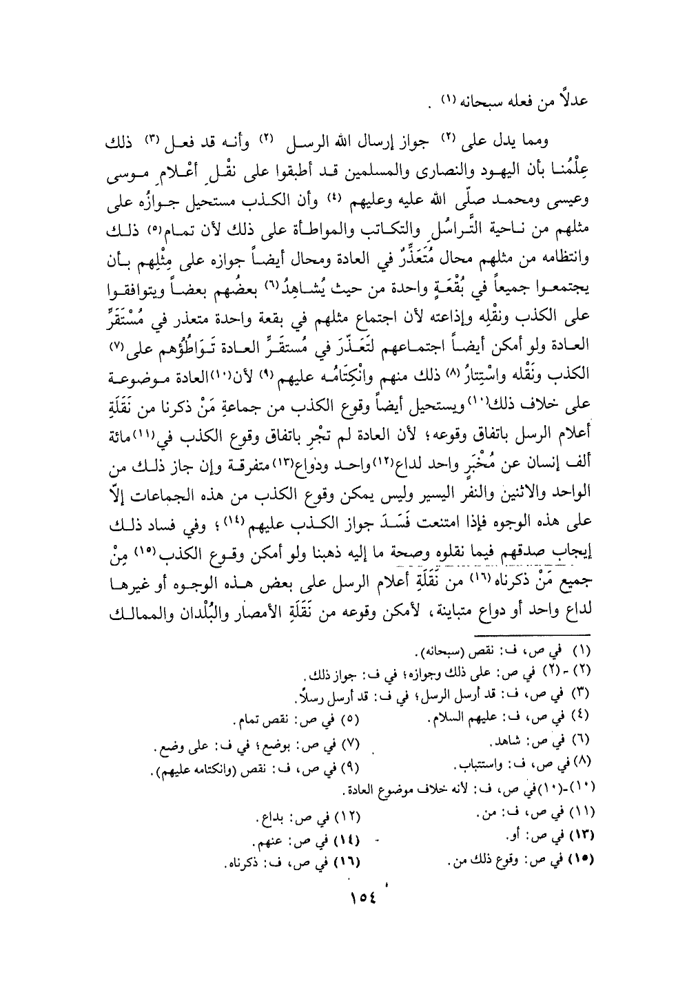 وَمِمَّا يدل على جَوَاز إرْسَال الله الرُّسُل وَأَنه قد فعل ذَلِك علمنَا بِأَن الْيَهُود وَالنَّصَارَى وَالْمُسْلِمين قد أطبقوا على نقل أَعْلَام مُوسَى وَعِيسَى وَمُحَمّد صلى الله عَلَيْهِ وَسلم وَعَلَيْهِم وَأَن الْكَذِب مُسْتَحِيل جَوَازه على مثلهم من نَاحيَة التراسل والتكاتب المواطأة على ذَلِك لِأَن تَمام ذَلِك وانتظامه من مثلهم محَال مُتَعَذر فِي الْعَادة ومحال أَيْضا جَوَازه على مثلهم بِأَن يجتمعوا جَمِيعًا فِي بقْعَة وَاحِدَة من حَيْثُ يُشَاهد بَعضهم بَعْضًا ويتوافقوا على الْكَذِب وَنَقله وإذاعته لِأَن اجْتِمَاع مثلهم فِي بقْعَة وَاحِدَة مُتَعَذر فِي مُسْتَقر الْعَادة وَلَو أمكن أَيْضا اجْتِمَاعهم لتعذر فِي مُسْتَقر الْعَادة تواطؤهم على الْكَذِب وَنَقله واستتار ذَلِك مِنْهُم وانكتامه عَلَيْهِم لِأَن الْعَادة مَوْضُوعَة على خلاف ذَلِك ويستحيل أَيْضا وُقُوع الْكَذِب من جمَاعَة من ذكرنَا من نَقله أَعْلَام الرُّسُل بِاتِّفَاق وُقُوعه لِأَن الْعَادة لم تجر بِاتِّفَاق وُقُوع الْكَذِب فِي مائَة ألف إِنْسَان عَن مخبر وَاحِد لداع وَاحِد ودواع مُتَفَرِّقَة وَإِن جَازَ ذَلِك من الْوَاحِد والاثنين والنفر الْيَسِير وَلَيْسَ يُمكن وُقُوع الْكَذِب من هَذِه الْجَمَاعَات إِلَّا على هَذِه الْوُجُوه فَإِذا امْتنعت فسد جَوَاز الْكَذِب عَلَيْهِم وَفِي فَسَاد ذَلِك إِيجَاب صدقهم فِيمَا نقلوه وَصِحَّة مَا إِلَيْهِ ذَهَبْنَا وَلَو أمكن وُقُوع الْكَذِب من جَمِيع مَا ذَكرْنَاهُ من نقلة أَعْلَام الرُّسُل على بعض هَذِه الْوُجُوه أَو غَيرهَا لداع وَاحِد أَو دواع متباينة لأمكن وُقُوعه من نقلة الْأَمْصَار والبلدان والممالك