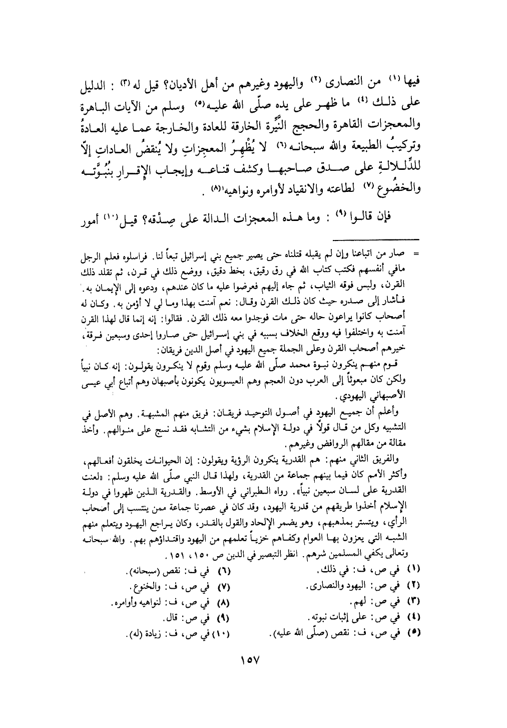 فِيهَا من النَّصَارَى وَالْيَهُود وَغَيرهم من أهل الْأَدْيَان قيل لَهُ الدَّلِيل على ذَلِك مَا ظهر على يَده صلى الله عَلَيْهِ وَسلم من الْآيَات الباهرة والمعجزات الْقَاهِرَة والحجج النيرة الخارقة للْعَادَة والخارجة عَمَّا عَلَيْهِ الْعَادة وتركيب الطبيعة وَالله سُبْحَانَهُ لَا يظْهر المعجزات وَلَا ينْقض الْعَادَات إِلَّا للدلالة على صدق صَاحبهَا وكشف قناعه وَإِيجَاب الْإِقْرَار بنبوته والخضوع لطاعته والانقياد لأوامره ونواهيه