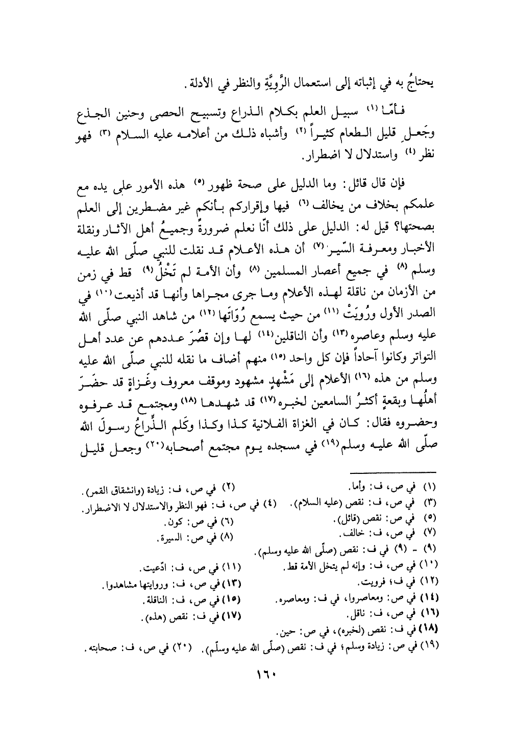 فَإِن قَالَ قَائِل وَمَا الدَّلِيل على صِحَة ظُهُور هَذِه الْأُمُور على يَده مَعَ علمكُم بِخِلَاف من يُخَالف فِيهَا وإقراركم بأنكم غير مضطرين إِلَى الْعلم بِصِحَّتِهَا قيل لَهُ الدَّلِيل على ذَلِك أَنا نعلم ضَرُورَة وَجَمِيع أهل الْآثَار ونقلة الْأَخْبَار وَمَعْرِفَة السّير أَن هَذِه الْأَعْلَام قد نقلت للنَّبِي صلى الله عَلَيْهِ وَسلم فِي جَمِيع أعصار الْمُسلمين وَأَن الْأمة لم تخل قطّ فِي زمن من الْأَزْمَان من ناقلة لهَذِهِ الْأَعْلَام وَمَا جرى مجْراهَا وَأَنَّهَا قد أذيعت فِي الصَّدْر الأول وَرويت من حَيْثُ يسمع رواتها من شَاهد النَّبِي صلى الله عَلَيْهِ وَسلم وعاصره وَأَن الناقلين لَهَا وَإِن قصر عَددهمْ عَن عدد أهل التَّوَاتُر وَكَانُوا آحادا فَإِن كل وَاحِد مِنْهُم أضَاف مَا نَقله للنَّبِي صلى الله عَلَيْهِ وَسلم من هَذِه الْأَعْلَام إِلَى مشْهد مشهود وموقف مَعْرُوف وغزاة قد حضر أَهلهَا وبقعة أَكثر السامعين لخبره قد شَهِدَهَا ومجتمع قد عرفوه وحضروه فَقَالَ كَانَ فِي الْغُزَاة الْفُلَانِيَّة كَذَا وَكَذَا وكلم الذِّرَاع رَسُول الله صلى الله عَلَيْهِ وَسلم فِي مَسْجده يَوْم مُجْتَمع أَصْحَابه وَجعل قَلِيل