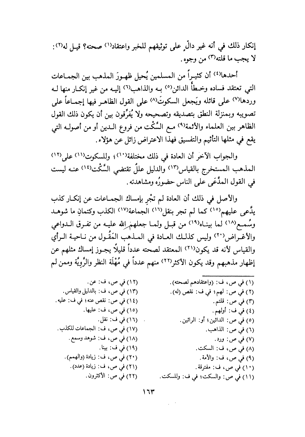 أَحدهَا أَن كثيرا من الْمُسلمين يحِيل ظُهُور الْمَذْهَب بَين الْجَمَاعَات الَّتِي تعتقد فَسَاده وَخطأ الدَّائِن بِهِ والذاهب إِلَيْهِ من غير إِنْكَار مِنْهَا لَهُ وردهَا على قَائِله وَيجْعَل السُّكُوت على القَوْل الظَّاهِر فِيهَا إِجْمَاعًا على تصويبه وبمنزلة النُّطْق بتصديقه وتصحيحه وَلَا يفرقون بَين أَن يكون ذَلِك القَوْل الظَّاهِر بَين الْعلمَاء وَالْأَئِمَّة مَعَ السكت من فروع الدّين أَو من أُصُوله الَّتِي يَقع فِي مثلهَا التأثيم والتفسيق فَهَذَا الِاعْتِرَاض زائل عَن هَؤُلَاءِ