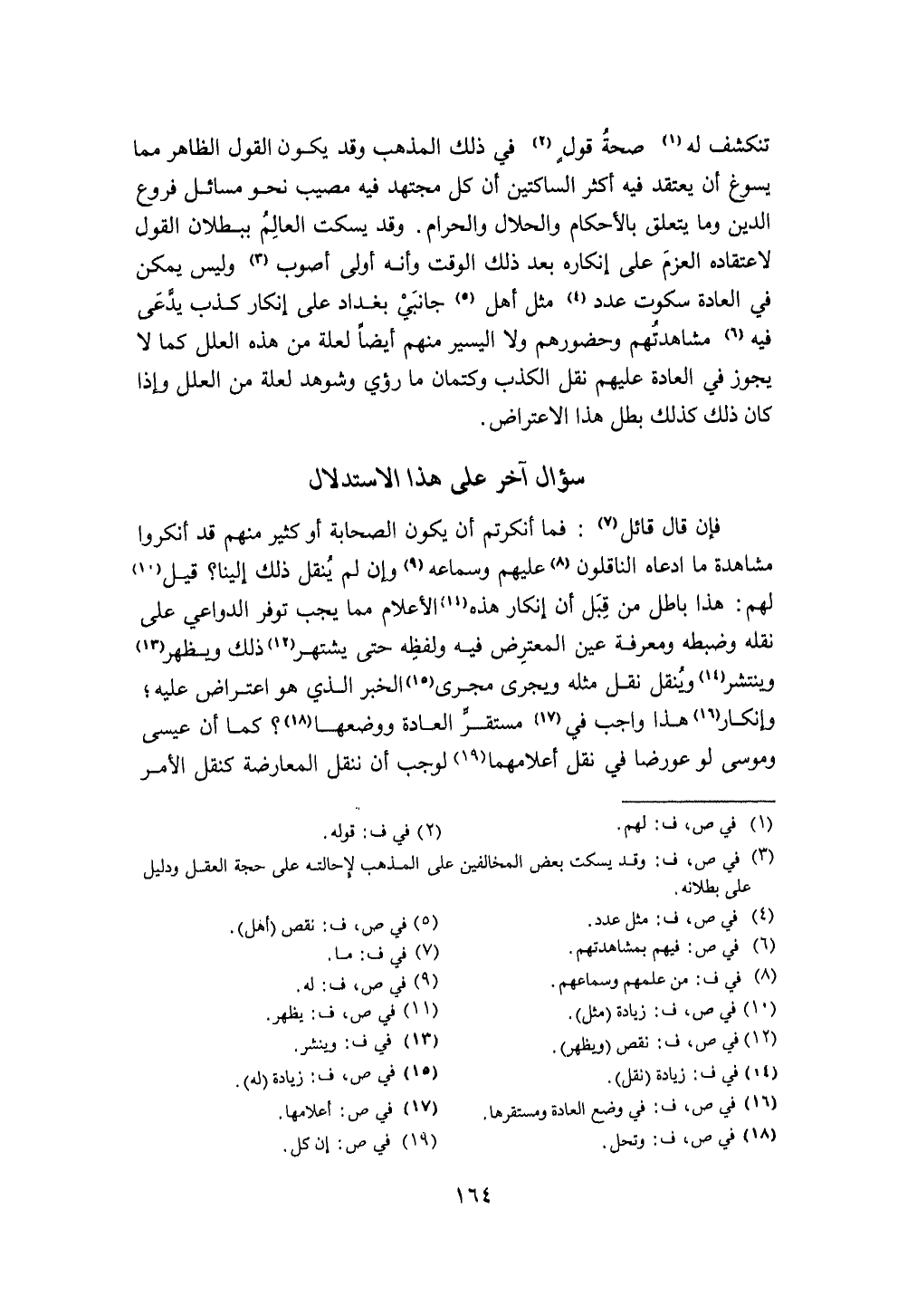 فَإِن قَالَ قَائِل فَمَا أنكرتم أَن يكون الصَّحَابَة أَو كثير مِنْهُم قد أَنْكَرُوا مُشَاهدَة مَا ادَّعَاهُ الناقلون عَلَيْهِم وسماعه وَإِن لم ينْقل ذَلِك إِلَيْنَا قيل لَهُم هَذَا بَاطِل من قبل أَن إِنْكَار هَذِه الْأَعْلَام مِمَّا يجب توفر الدَّوَاعِي على نَقله وَضَبطه وَمَعْرِفَة عين الْمُعْتَرض فِيهِ وَلَفظه حَتَّى يشْتَهر ذَلِك وَيظْهر وينتشر وينقل نقل مثله ويجرى مجْرى الْخَبَر الَّذِي هُوَ اعْتِرَاض عَلَيْهِ وإنكار هَذَا وَاجِب فِي مُسْتَقر الْعَادة ووضعها كَمَا أَن عِيسَى ومُوسَى لَو عورضا فِي نقل أعلامهما لوَجَبَ أَن ننقل الْمُعَارضَة كنقل الْأَمر
