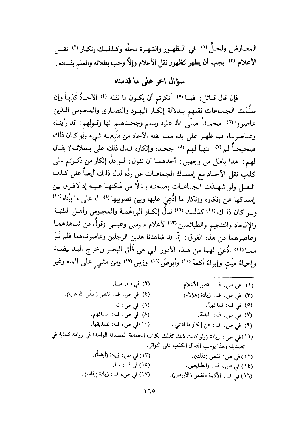فَإِن قَالَ قَائِل فَمَا أنكرتم أَن يكون مَا نَقله الْآحَاد كذبا وَإِن سلمت الْجَمَاعَات نقلهم بِدلَالَة إِنْكَار الْيَهُود وَالنَّصَارَى وَالْمَجُوس الَّذين عاصروا مُحَمَّدًا صلى الله عَلَيْهِ وَسلم وجحدهم لَهَا وَقَوْلهمْ قد رَأَيْنَاهُ وعاصرناه فَمَا ظهر على يَده مِمَّا نَقله الْآحَاد من متبعيه شَيْء وَلَو كَانَ ذَلِك صَحِيحا لم يتهيأ لَهُم جَحده وإنكاره فَدلَّ ذَلِك على بُطْلَانه يُقَال لَهُم هَذَا بَاطِل من وَجْهَيْن أَحدهمَا أَن نقُول لَو دلّ على إِنْكَار من ذكرْتُمْ على كذب نقل الْآحَاد مَعَ إمْسَاك الْجَمَاعَات عَن رده لدل ذَلِك أَيْضا على كذب النَّقْل وَلَو شهِدت الْجَمَاعَات بِصِحَّتِهِ بَدَلا من سكتها عَلَيْهِ إِذْ لَا فرق بَين إِِمْسَاكهَا عَن إِنْكَاره وإنكار مَا ادعِي عَلَيْهَا وَبَين تصويبها لَهُ على مَا بَيناهُ وَلَو كَانَ ذَلِك كَذَلِك لدل على إِنْكَار البراهمة وَالْمَجُوس وَأهل التَّثْنِيَة والإلحاد والتنجيم والطبائعيين لأعلام مُوسَى وَعِيسَى وَقَول من شاهدهما وعاصرهما من هَذِه الْفرق إِنَّا قد شاهدنا هذَيْن الرجلَيْن وعاصرناهما فَلم نر مِمَّا ادعِي لَهما من هَذِه الْأُمُور الَّتِي هِيَ فلق الْبَحْر وَإِخْرَاج الْيَد بَيْضَاء وإحياء ميت وإبراء أكمه وأبرص وزمن وَمن مشي على المَاء وَغير